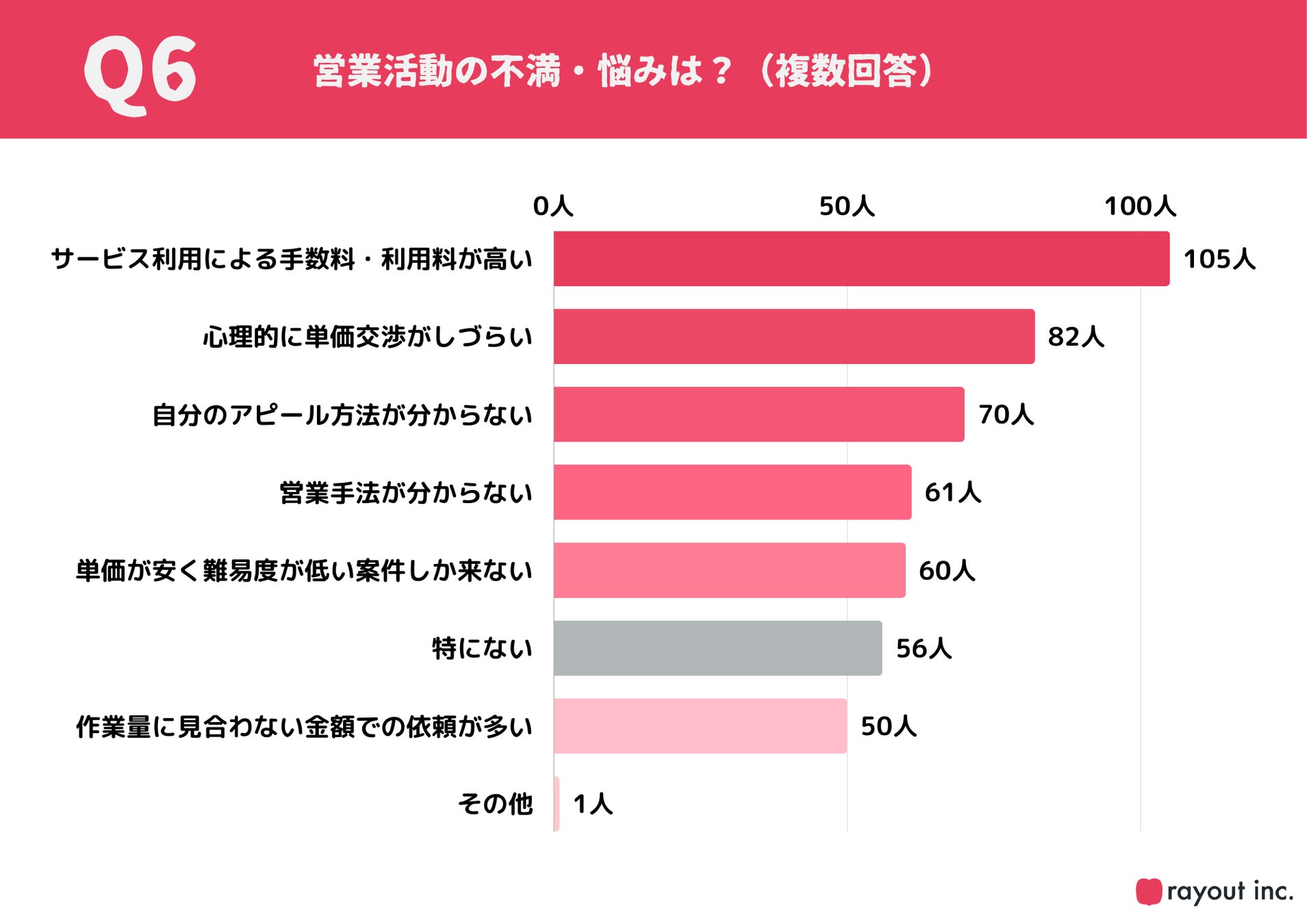 どのように営業をしているかを問う質問では(Q5)、「知り合いからの紹介」「クラウドソーシングサービス、マッチングサービスの活用」と答えた人は各102人となり、最も多い結果となりました。しかし、営業活動の不満・悩みについての質問では(Q6)、「サービス利用による手数料・利用料が高い」と答えた人が105人と最も多く、クラウドソーシングサービス等の費用に悩まされながらも、営業手法としては欠かせないものとなっている現状が伺えました。