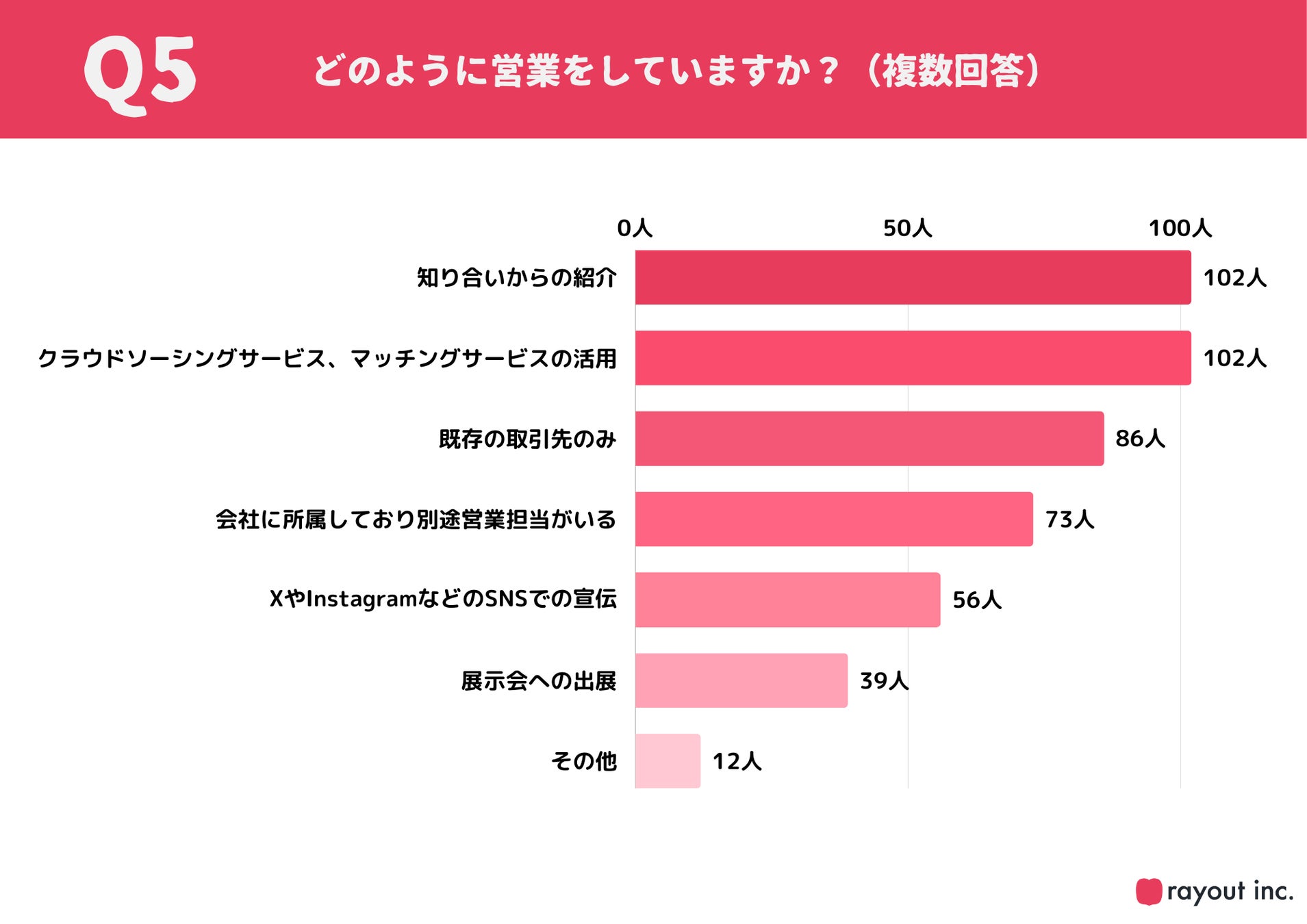 また、営業手法に関する質問で「既存の取引先のみ」と答えた人は82人と二番目に多く、一定の顧客基盤を築いているクリエイターが比較的多いことがわかりました。
