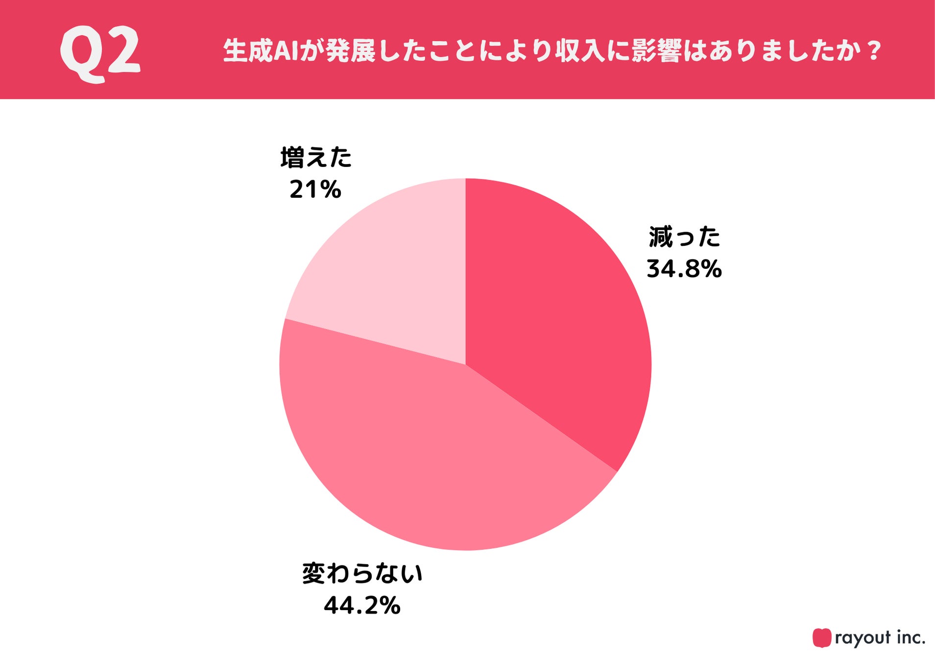 生成AIを「よく使用する」「たまに使用する」を選んだ人が半数以上を占める一方、生成AIの発展で収入が減った人が34.8%、増えた人が21%と、減った人の方が多い結果となりました。