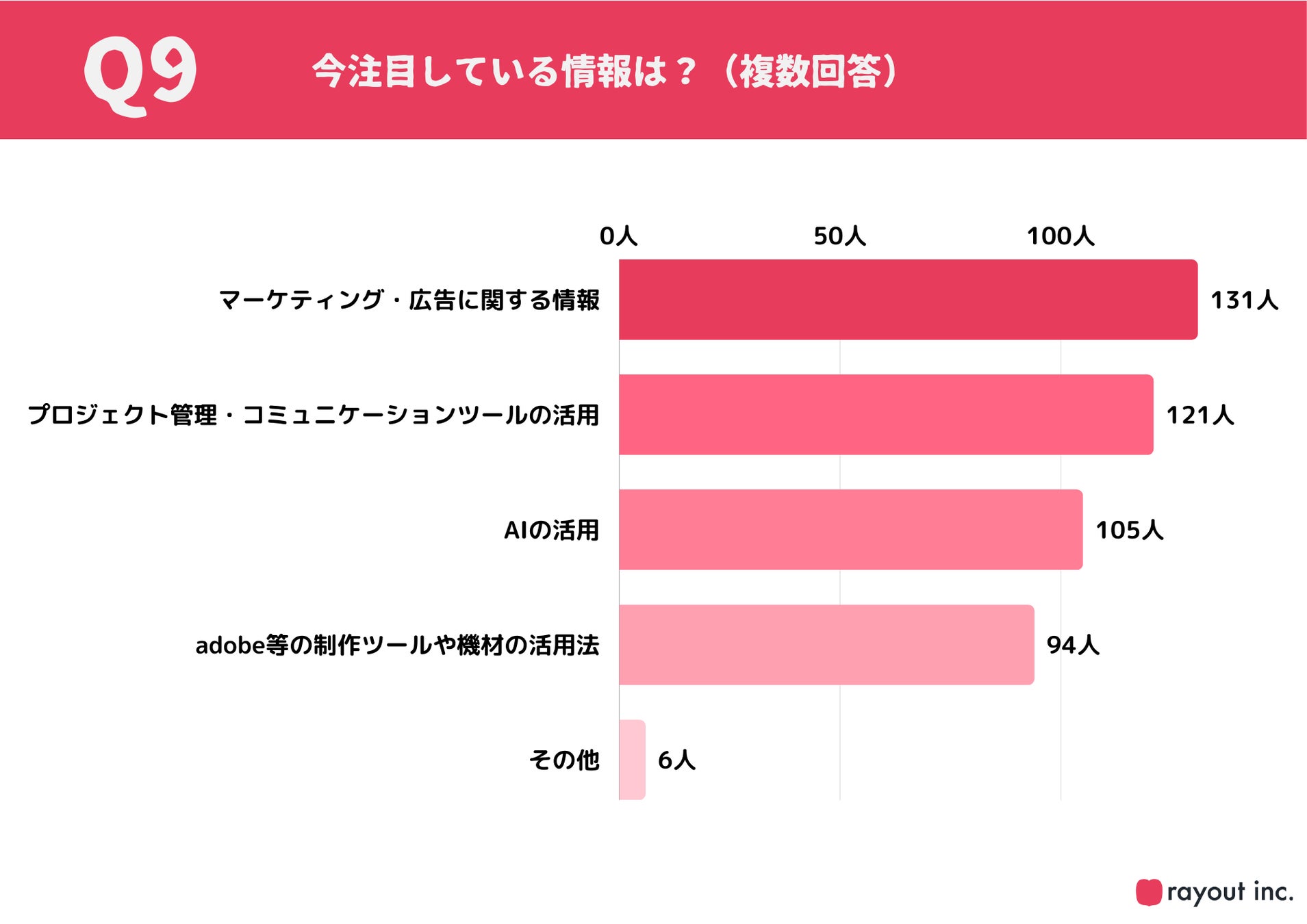 今注目している情報についての質問は(Q9)、「マーケティング・広告に関する情報」「プロジェクト管理・コミュニケーションツールの活用」が上位となりました。