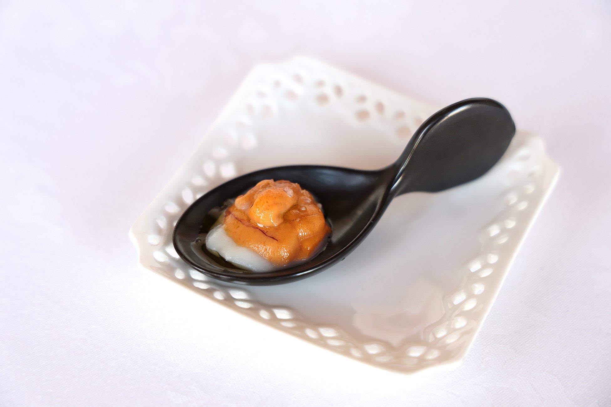 サルディーニャ産の海塩とシチリア産のエクストラバージンオリーブオイルを使ったアペリティーボ。海塩のマイルドな塩味がウニの甘さを引き出すシンプルなひと口前菜。
