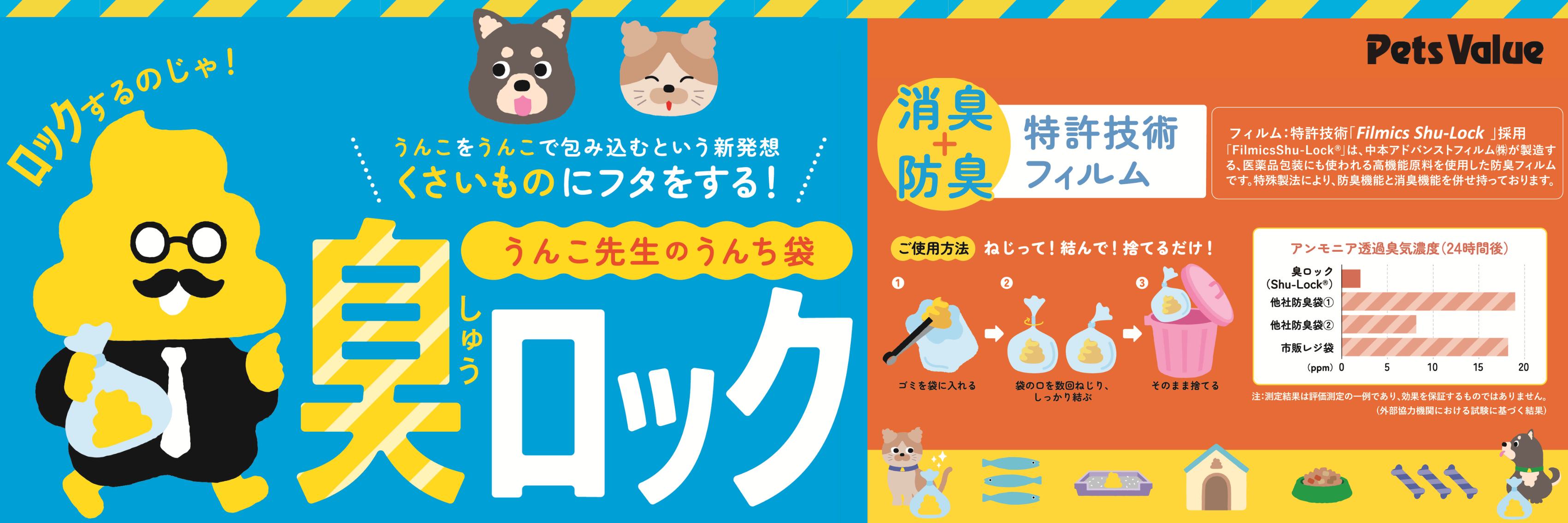 同製品は、防臭・消臭機能を兼ね備えた特許技術「Filmics Shu-Lock ®」をフィルムに採用した、愛犬や愛猫のうんちを回収するうんち袋です。