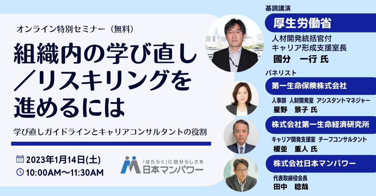国家資格キャリアコンサルタント養成講座を開催する株式会社日本マンパワー(東京都千代田区、代表取締役・楠木賢治)は、2023年1月14日(土)にオンラインWEBセミナー『【特別イベント】組織内における学び直し/リスキリングを進めるためには~学び直しガイドラインとキャリアコンサルタントの役割~』を開催いたします。
