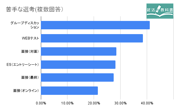 得意な選考でESと面接(オンライン)が多く選ばれ、苦手な選考ではグループディスカッションが40%以上を占めている