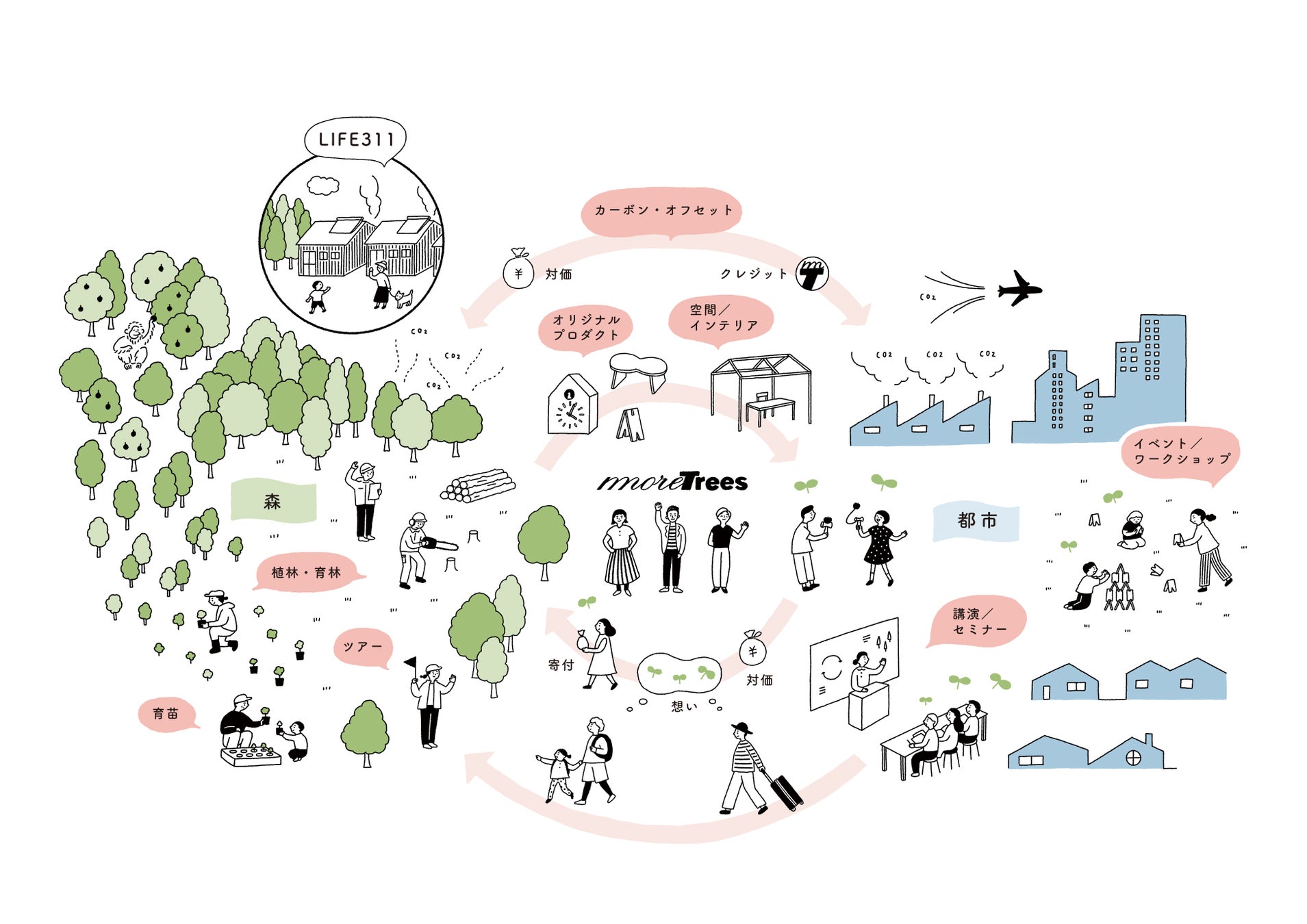 more treesは、音楽家 坂本龍一が創立し、建築家 隈研吾が代表を務める森林保全団体です。東日本大震災以降、岩手県住田町をはじめ気仙地域と関わりながら復興支援と森づくりを続けています。地域で採取した種子から苗木を育てる手法により、遺伝的多様性を守る森づくりを実践するとともに、国内外の個人・企業からの寄付を集める「都市と森をつなぐ」役割を担っています。