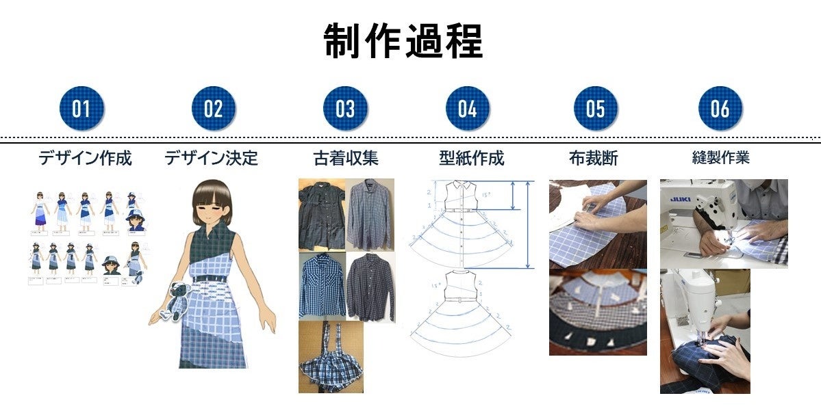 デザインコンセプト:家族の思い出が詰まった洋服をリメイクしたワンピース。夏休みにお出かけをし、さらに思い出を増やしていくアルバムのような一着。父親の洋服を娘へ、兄のおさがりが妹へのプレゼントヘ。残った端切れは、クマのぬいぐるみの詰め物として活用。
