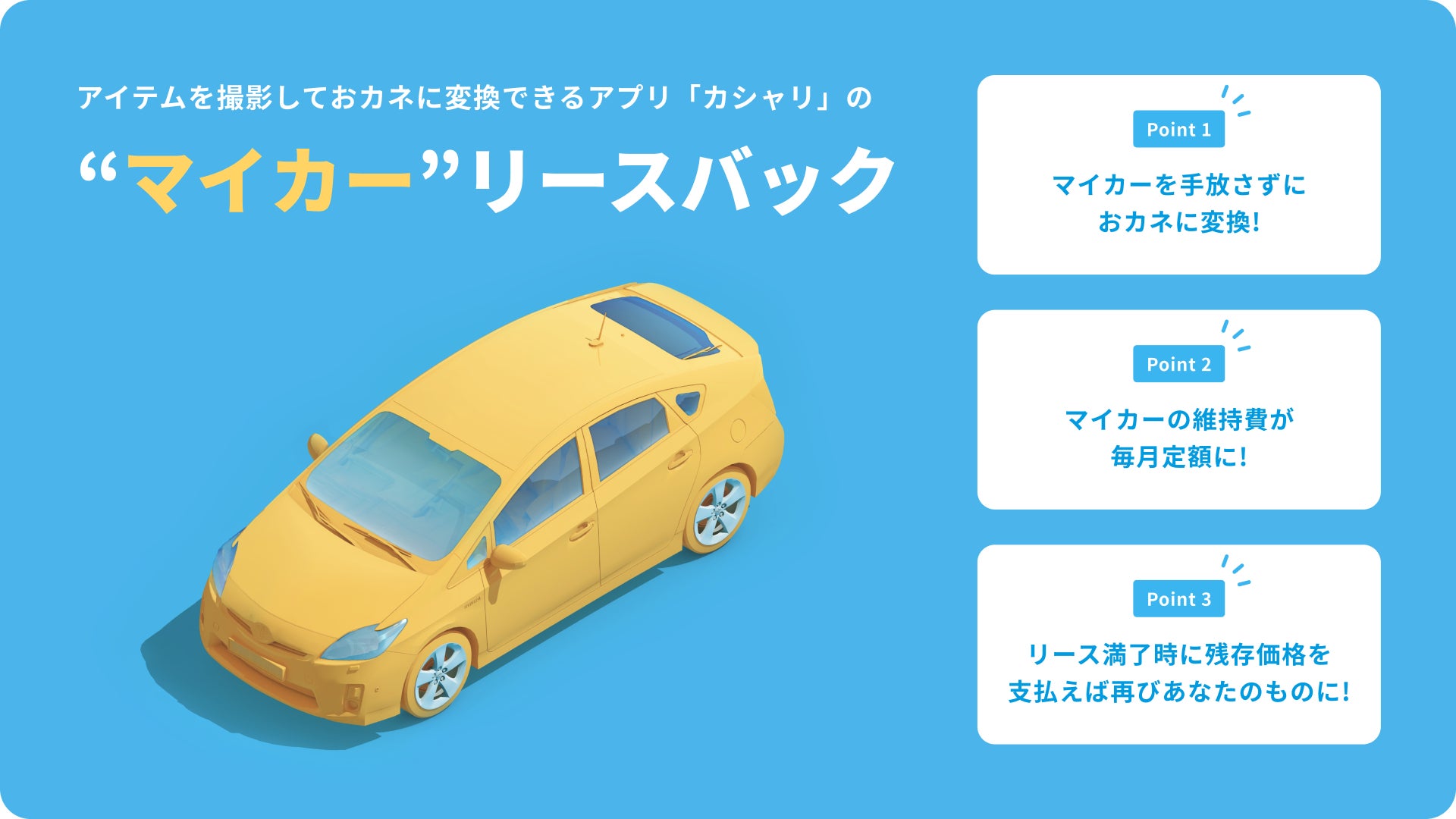 「cashari / カシャリ」では個人が所有する資産において大きな割合を占める自動車を新たに取り扱い、「マイカーリースバック」として提供を開始しました。マイカーを売却し資金化した後もそのまま乗り続けることができるサービスです。面倒な対面での手続きは無く、アプリの操作だけでマイカーの査定やリースバックの申込が完結し、マイカーの買取代金を受取ることができます。