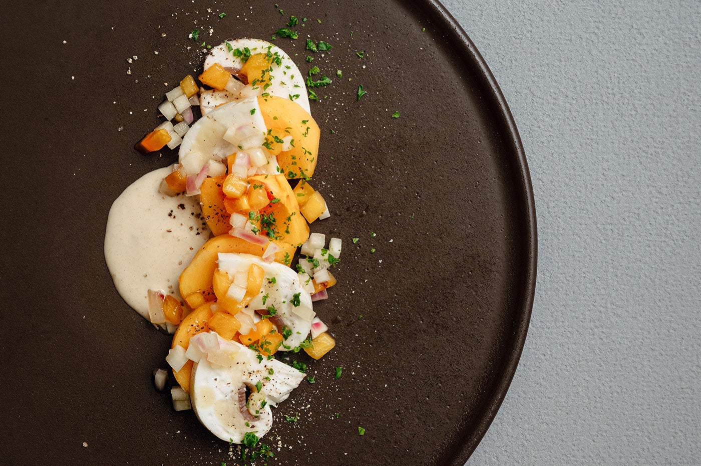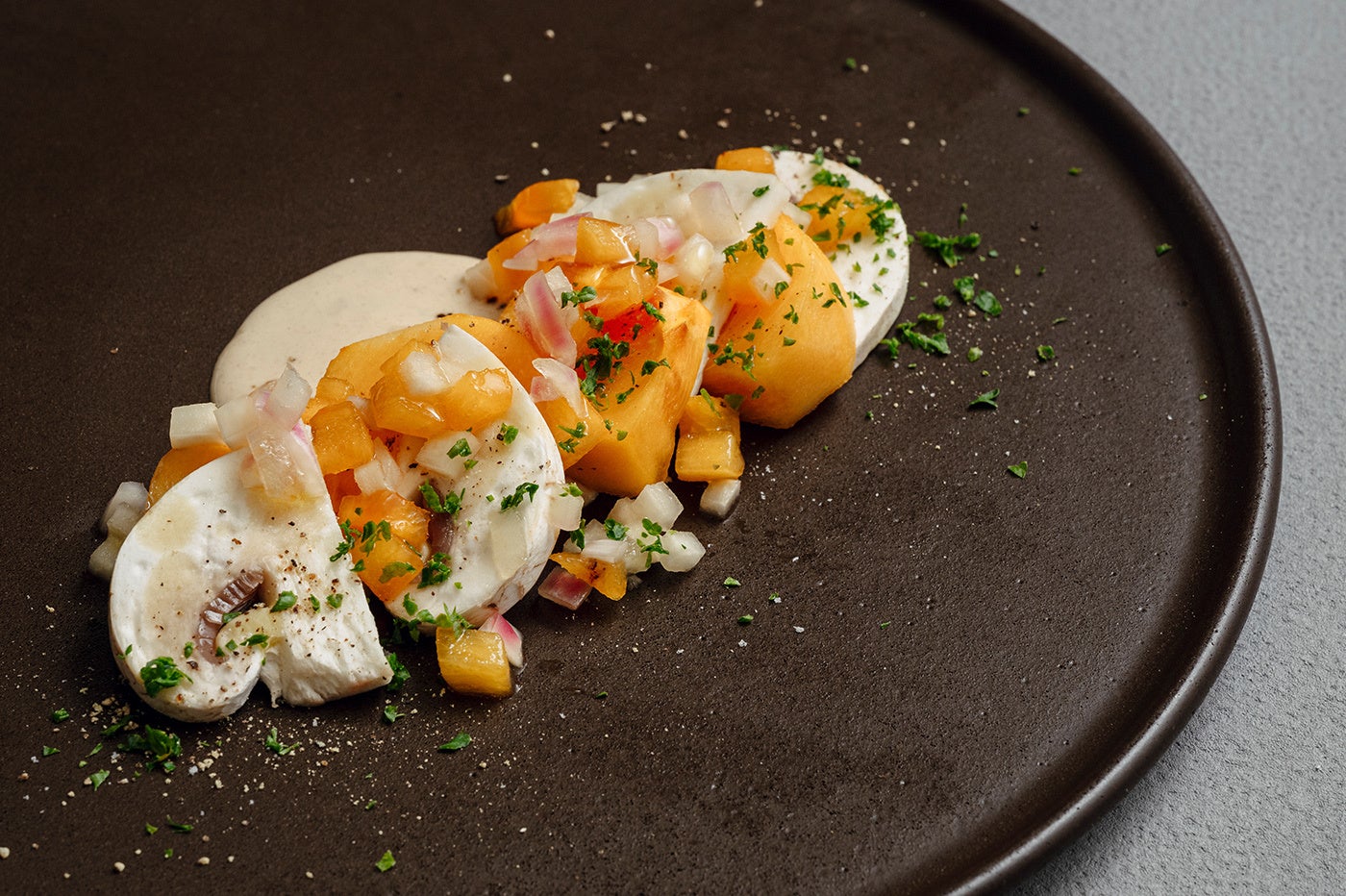 マッシュルームと柿のタヒニで食べるカルパッチョ