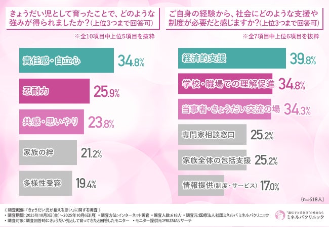 「きょうだい児として育ったことで、どのような強みが得られたか」について尋ねたところ、『責任感・自立心(34.8%)』『忍耐力(25.9%)』『共感・思いやり(23.8%)』が上位に挙がりました。