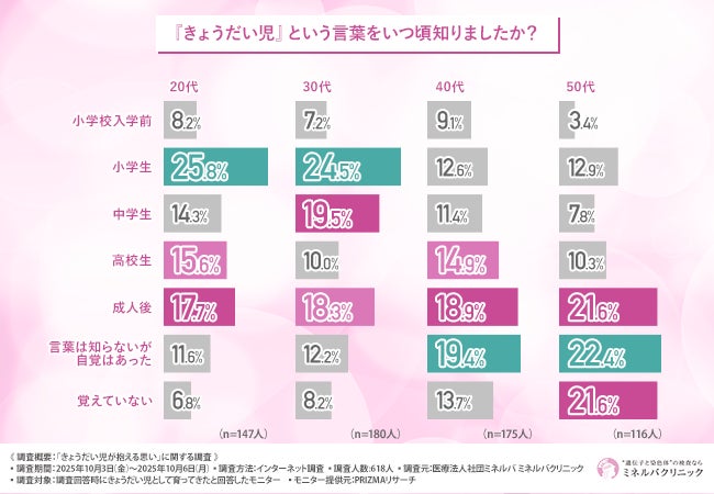 「きょうだい児」という言葉の認知時期は、20〜30代では「小学校低・中・高学年」が中心だったのに対し、40〜50代では「言葉は知らないが自覚はあった」の回答が最多となりました。
