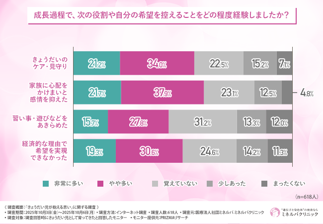 そこで今回、ミネルバクリニック(https://minerva-clinic.or.jp/)を運営する医療法人社団ミネルバは、きょうだい児として育ってきた方を対象に、「きょうだい児が抱える思い」に関する調査を実施しました。