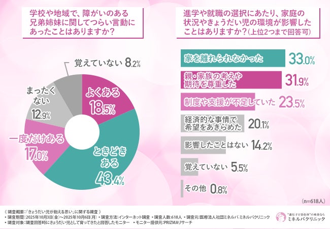 「進学や就職の選択にあたり、家庭の状況やきょうだい児の環境が影響したことはあるか」と尋ねたところ、『家を離れられなかった(33.0%)』『親・家族の考えや期待を尊重した(31.9%)』『制度や支援が不足していた(23.5%)』が上位になりました。