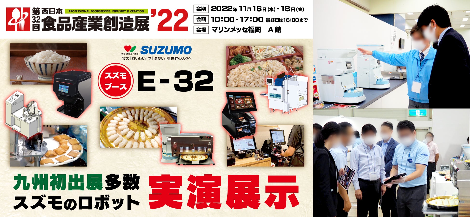 鈴茂器工株式会社(本社:東京都中野区、代表取締役社長:鈴木美奈子、以下 鈴茂器工)は2022年11月16日から18日に開催される展示会 『第32回 西日本食品産業創造展'22 (マリンメッセ福岡 A館)に出展いたします。九州エリアで初出展となるスズモの調理ロボットを多数展示予定です。スズモグループ製品を直接体感していただける機会となっております。皆さまのご来場を心よりお待ち申し上げます。