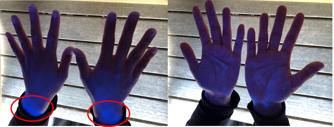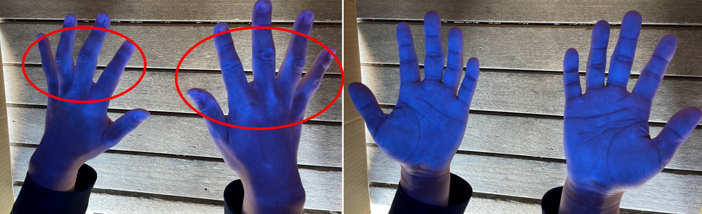 ②ブラックライトに手の平・手の甲をかざし、洗い残し部分を確認する