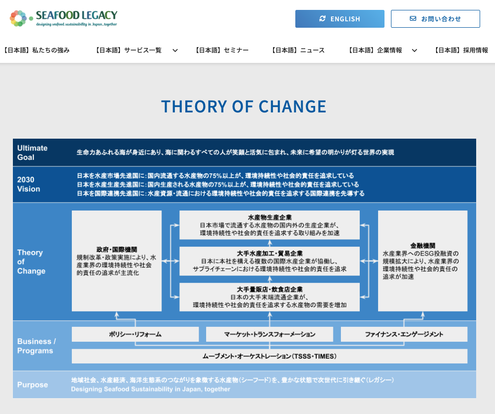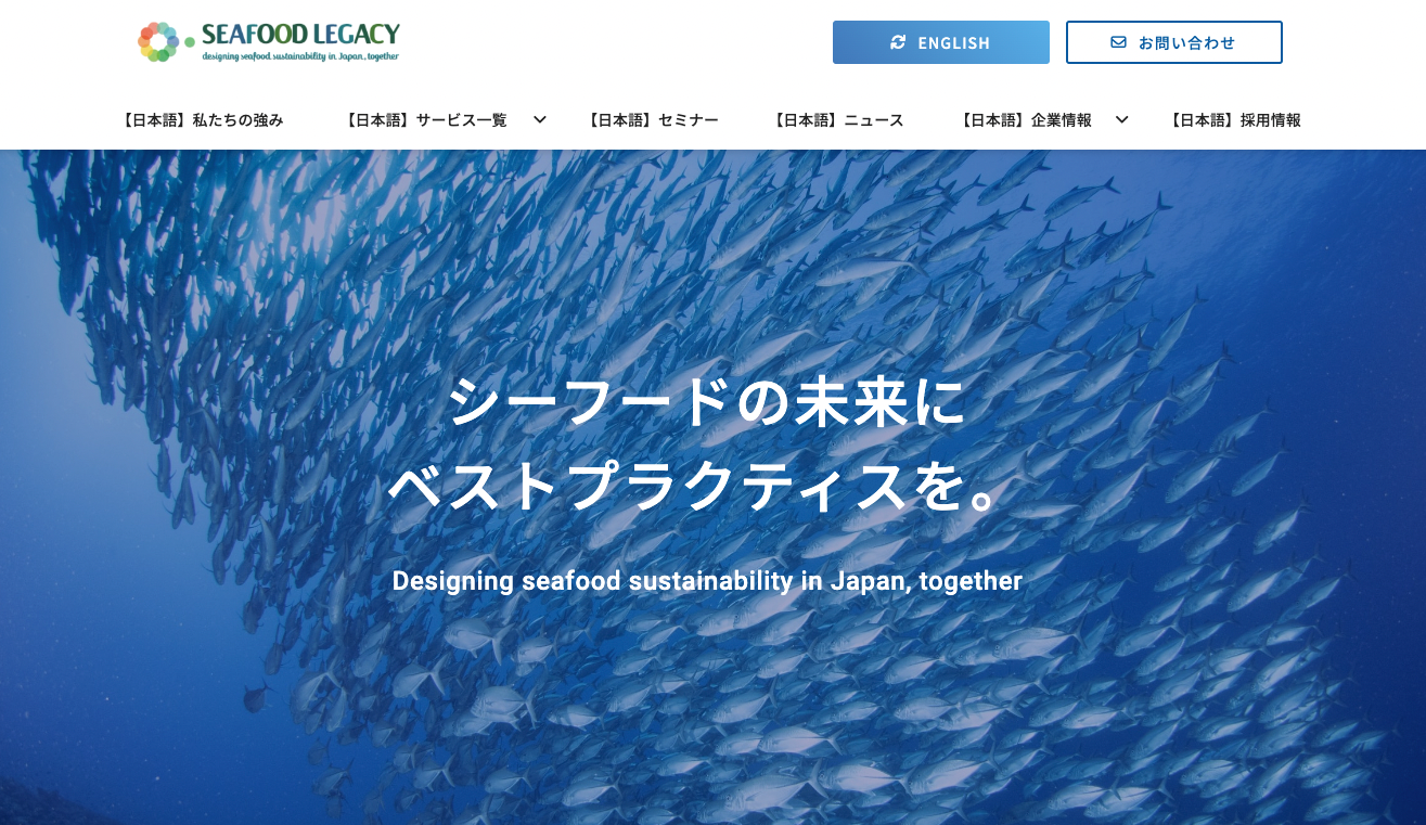 株式会社シーフードレガシーは、地域社会、水産経済、海洋生態系のつながりを象徴する水産物(シーフード)を豊かな状態で次世代に引き継ぐ(レガシー)ことをパーパスに、水産関連企業、金融機関、政府、NGOのみなさまのサステナブル・シーフード(持続可能な水産物)の推進に関する取り組みをコンサルティングするソーシャル・ベンチャーで、2015年に設立されました。