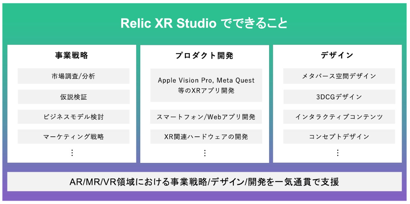 提携第一弾として、AR/MR/VRの新規事業開発を専門とする「Relic XR Studio」 を立ち上げました。両社のアセットを活かす体制構築に加え、XRのプロデュースを行う株式会社x garden代表 松谷氏を共同責任者に迎え、開発支援にとどまらず、XRを活用した事業戦略や企画立案、開発/実行まで一気通貫で支援可能な強固な体制でXR領域の新規事業開発を推進していきます。