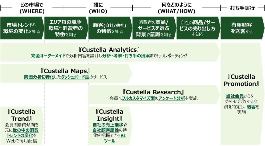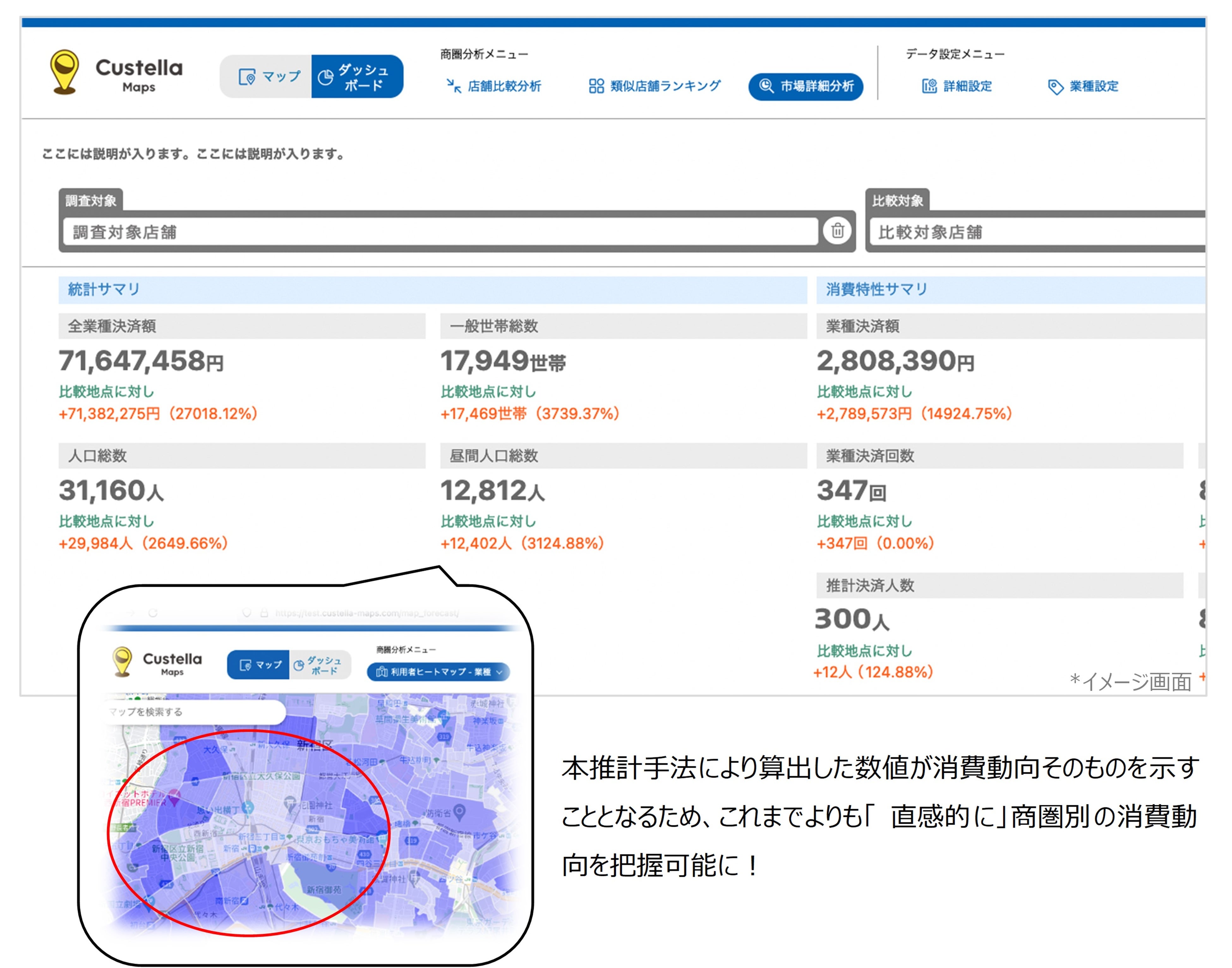 第一弾として、消費分析地図サービス「Custella Maps」の有償追加オプションをお申込みのお客さまに対し、本推計手法による消費データの提供を開始いたします。今後も各種「Custella」サービスへの実装を順次拡大して参ります。
