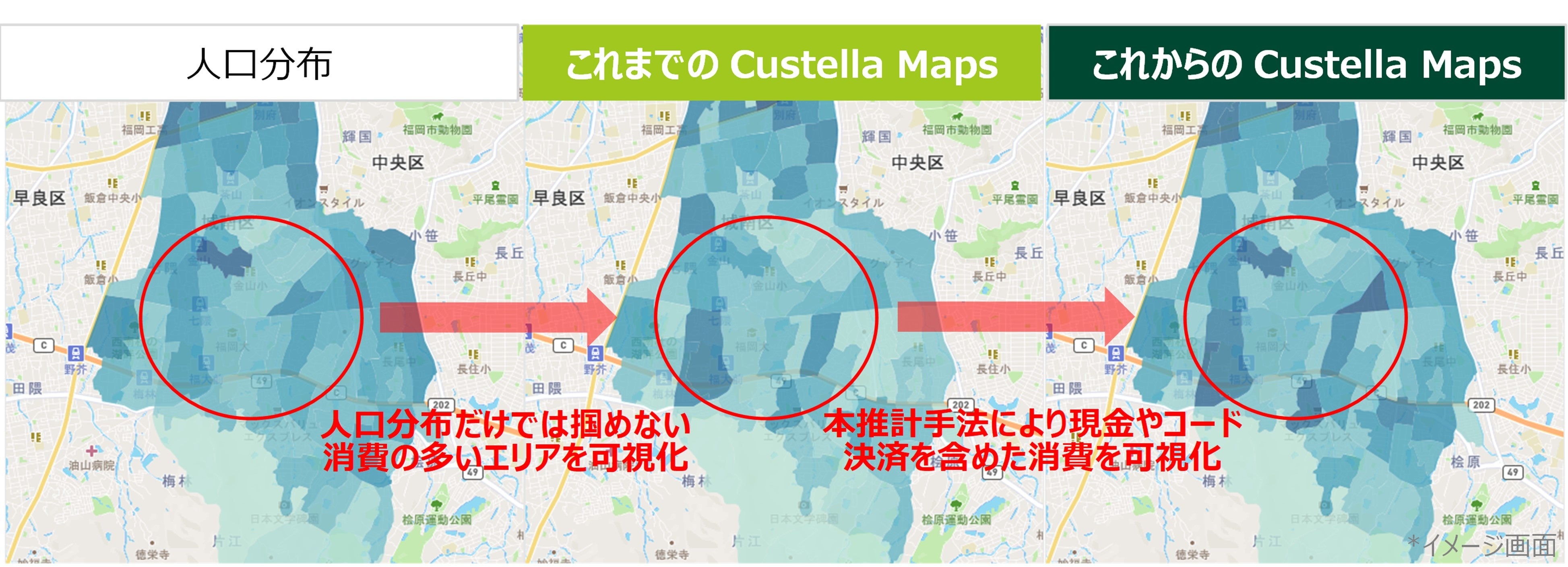 「Custella Maps」では、人口分布では掴めない「集客が見込めるエリア」をキャッシュレスデータに基づいて可視化しております。本推計手法により、さらに消費の実態に即した商圏を可視化・検証できるようになりました。