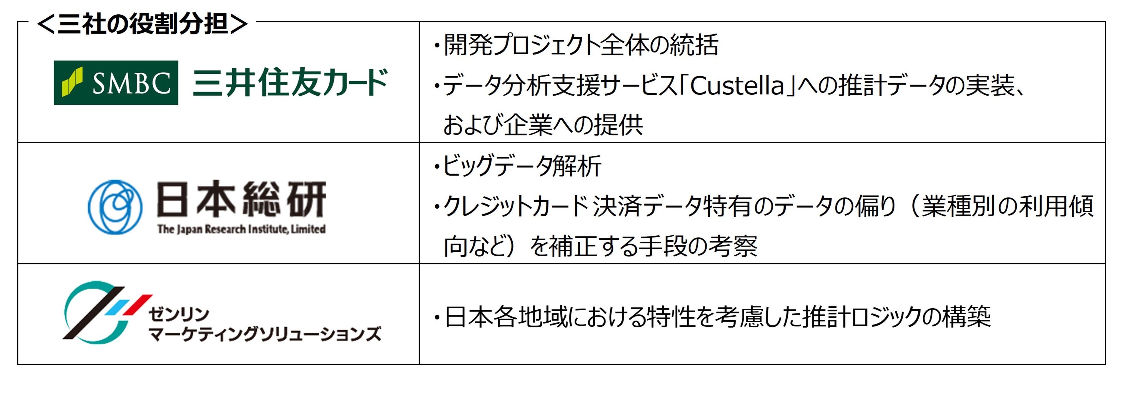 こうした声を受け、三井住友カードは、株式会社日本総合研究所および株式会社ゼンリンマーケティングソリューションズの技術支援を受け、クレジットカードの決済データをもとに、日本全国における決済手段に拘わらない消費データを算出する推計手法を確立しました。本推計手法の活用により、データ分析支援サービス「Custella」はキャッシュレスデータ分析を超え、全決済手段・全業種の消費データを網羅し、分析するサービスへと進化いたします。