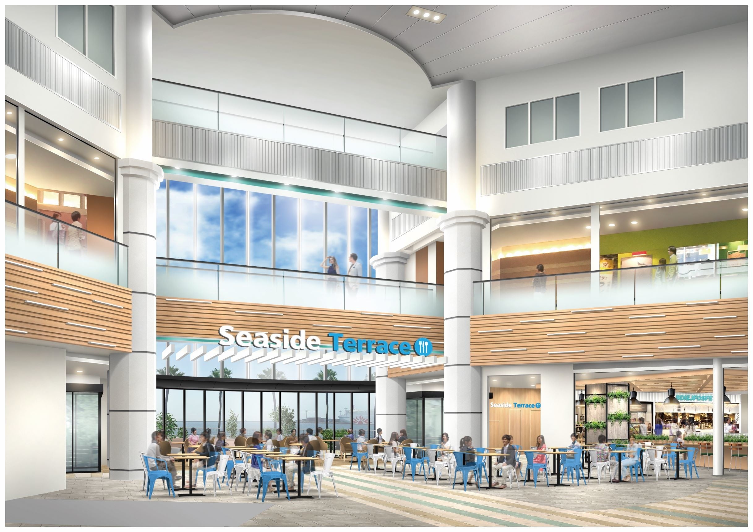 シーサイドテラスは、2025年、ATCに隣接する夢洲において大阪・関西万博が開催されるにあたり、増加する就労者や来館者のニーズに応えるため、商業ゾーンの中央部に約1,000平米のスペースで開設いたします。