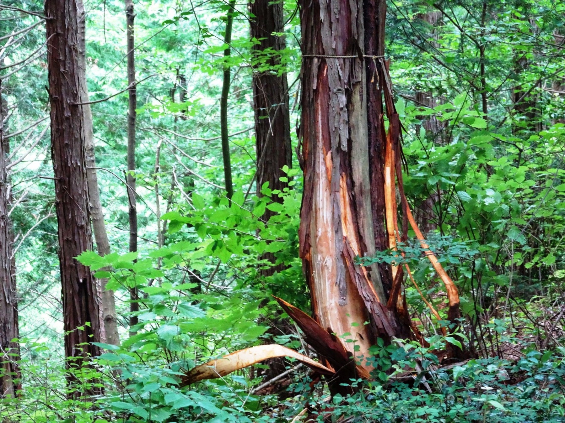 「クマ剥ぎ」は、ツキノワグマがスギやヒノキなどの樹皮をはいで歯や爪で傷つけたり、幹の内部を食べる樹木被害で、樹齢が長い優良木が対象となることが多く、4~7月の春先から初夏に多く発生します。