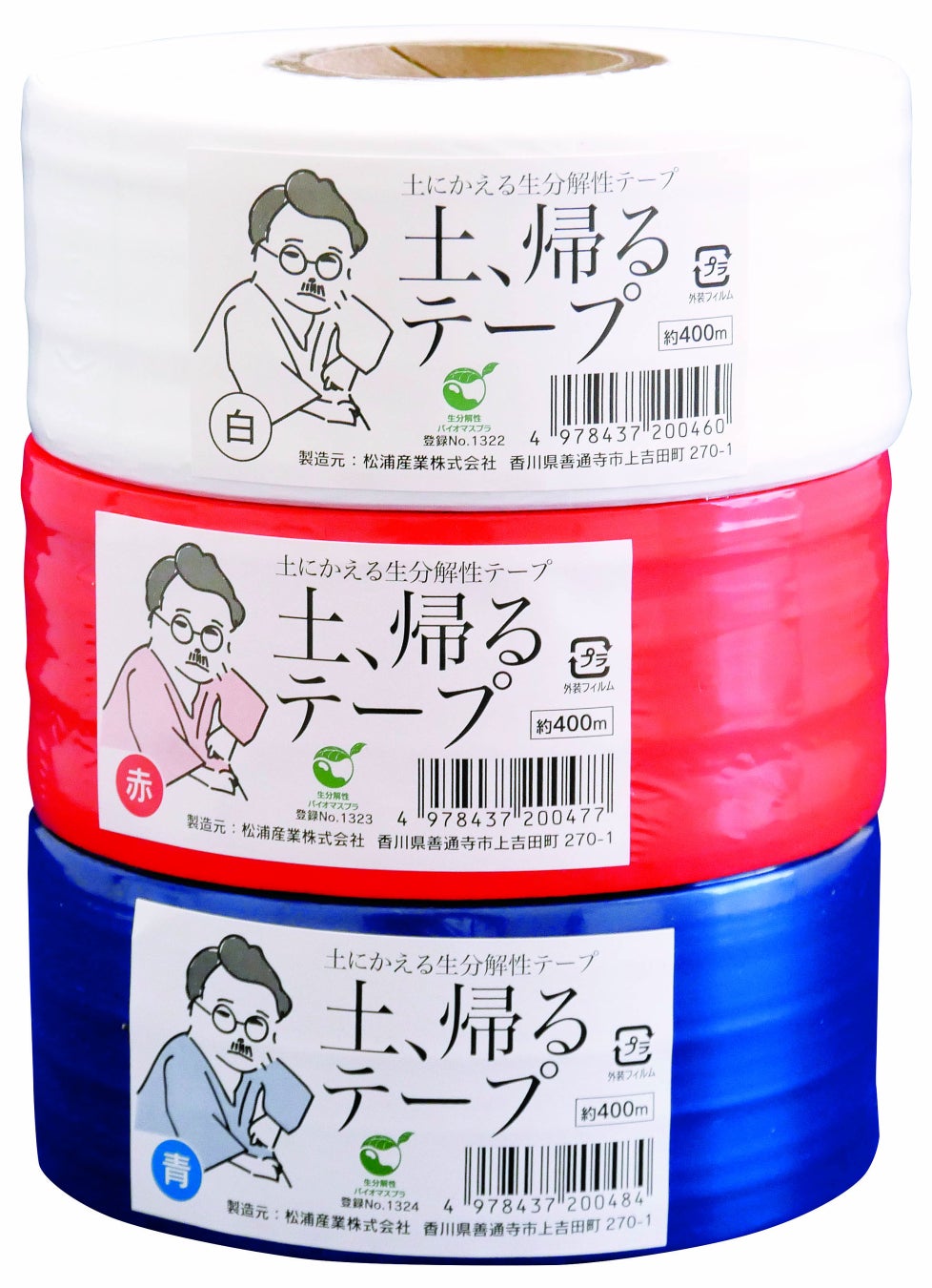このテープの製品名である「土、帰るテープ」は、松浦産業の本社がある香川県出身の作家、菊池寛先生の代表作「父帰る」から発案いたしました。そのため、パッケージも小説家風のイラストを採用しています。初披露となった昨年の農業WEEKで、自然環境に配慮した生分解テープの需要の高さを実感し、改めて、自社開発に踏み切ってよかったと思いました。