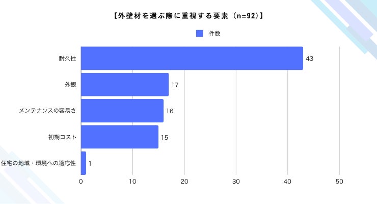 下記は、「外壁材を選ぶ際に最も重視する要素は何ですか?」(n=92)との質問に対する回答です。