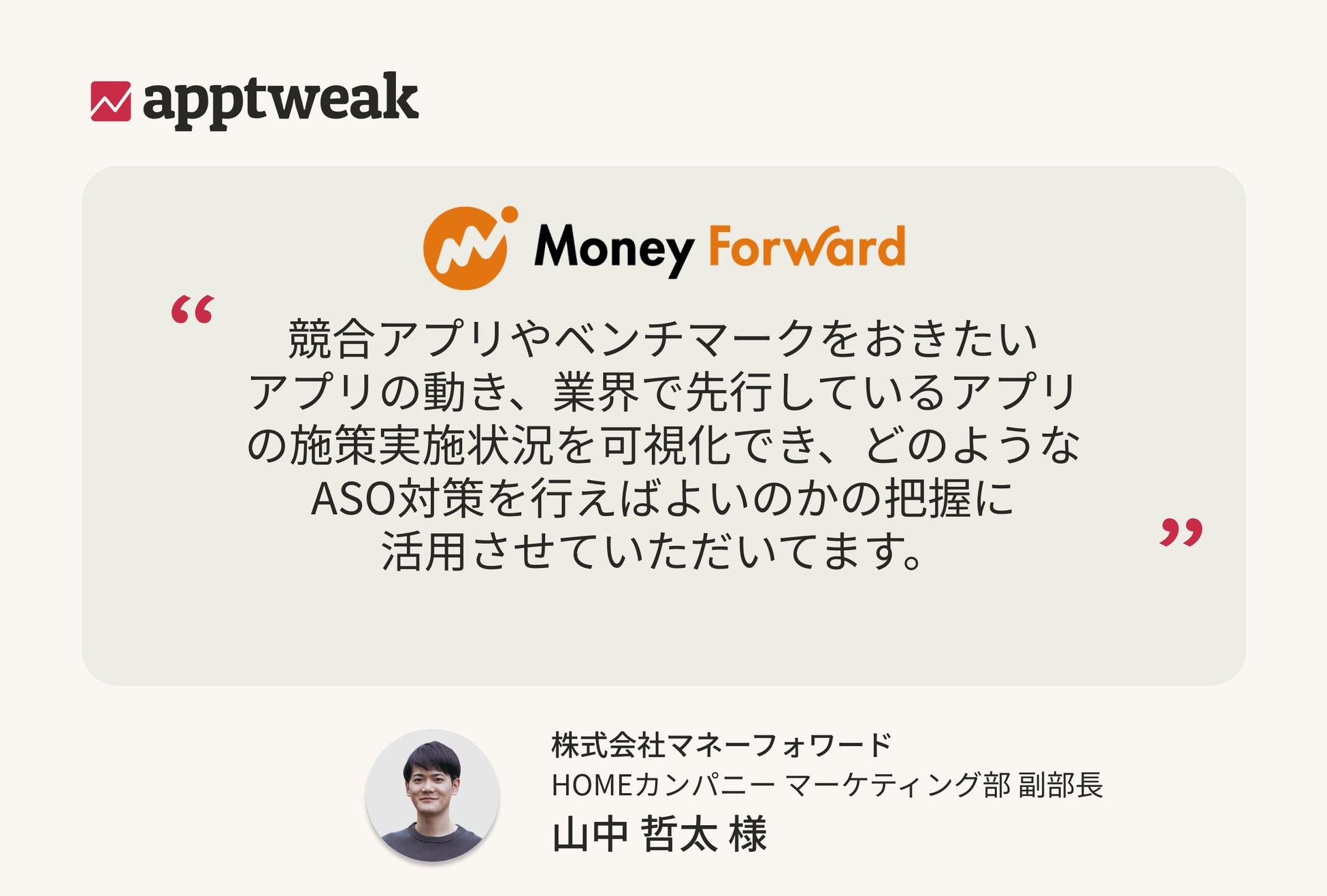 利用者数1,500万人 (※アプリのダウンロード数およびWEB登録者数の総計) を超える家計簿・資産管理サービス「マネーフォワード ME」を提供する株式会社マネーフォワード。同社にて、新規集客のためのプロモーションやLTV向上を促進するCRM領域を担当する山中哲太氏に、AppTweak導入の背景やその後の効果についてお話いただきました。