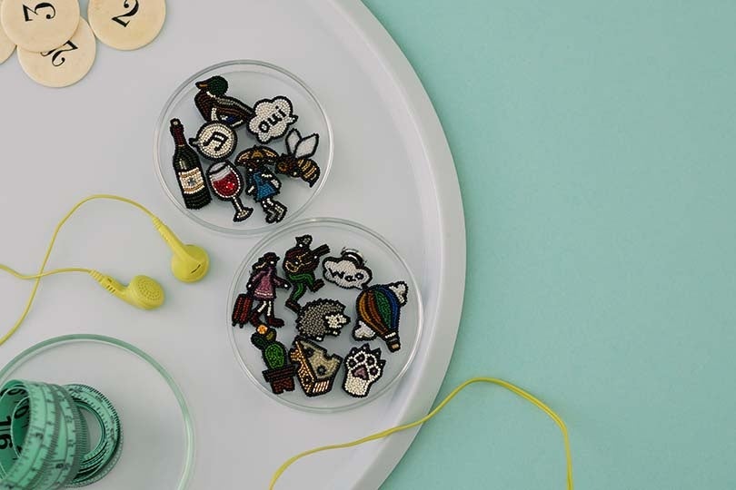 また、ラゲージタグのアクセサリーとして楽しめるPINSは、ビーズ刺繍作家 小林モー子氏によるデザインです。旅にまつわる楽しいエッセンスが繊細なビーズで表現されたPINSは、ラゲージタグに自分好みにカスタムしてオリジナルラゲージタグとして使用することが可能。今回はmolnのためにデザインされた2種と小林モー子氏の作品からセレクトしたものを合わせ全15種を展開します。旅先で電車を待っているとき、ホテルでパッキングを解くとき。旅の中のふとした瞬間に、愛着や遊び心を想い起こさせてくれるアクセサリーです。