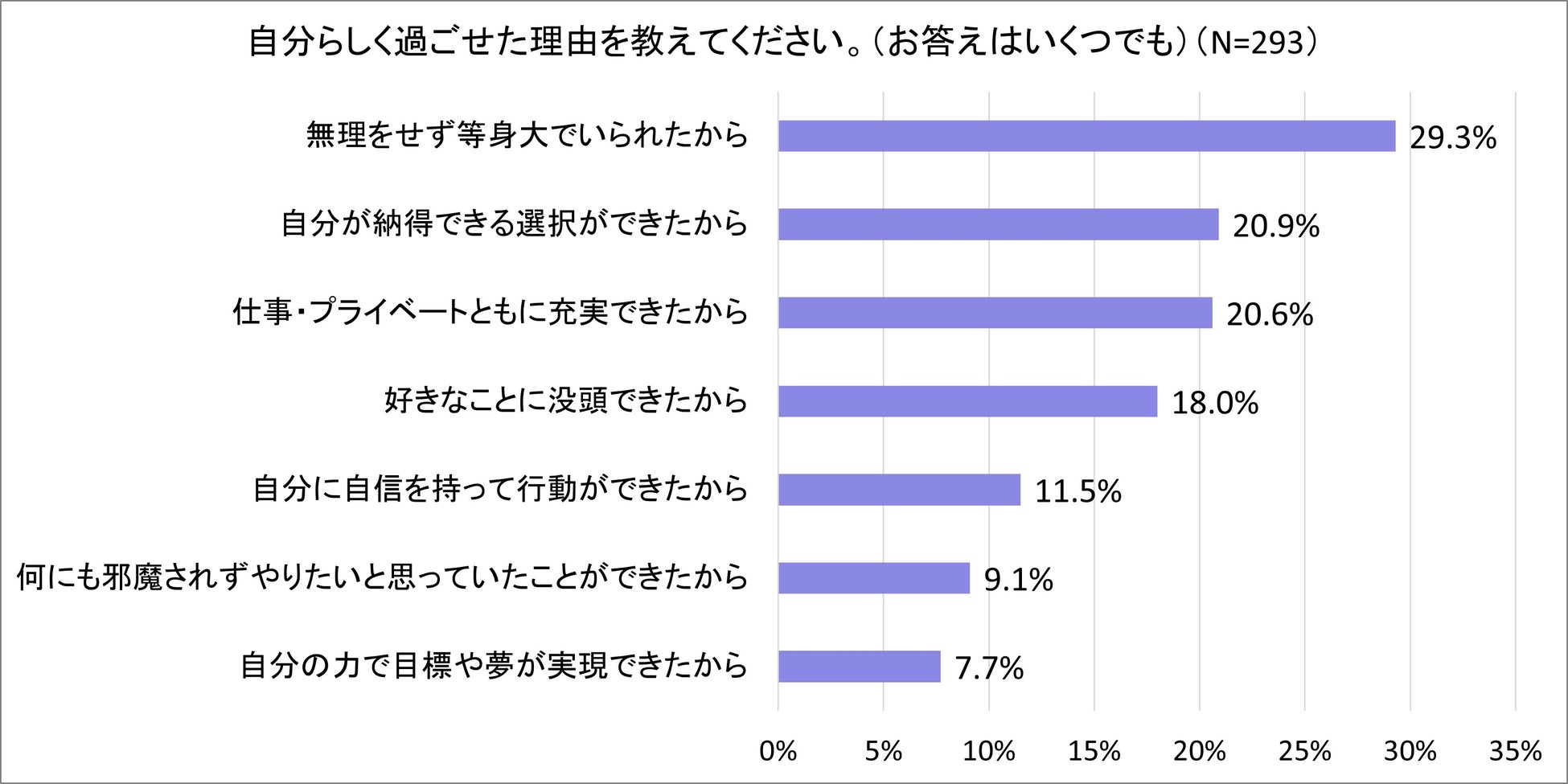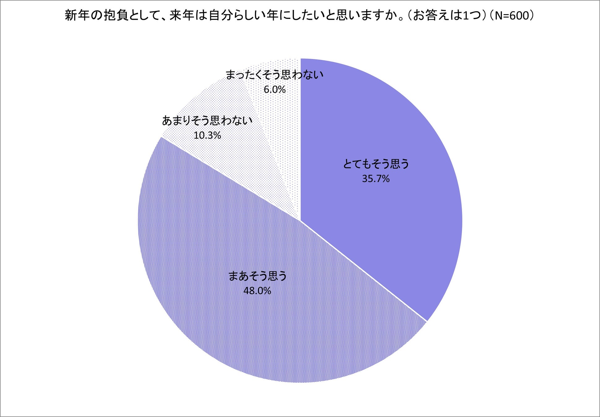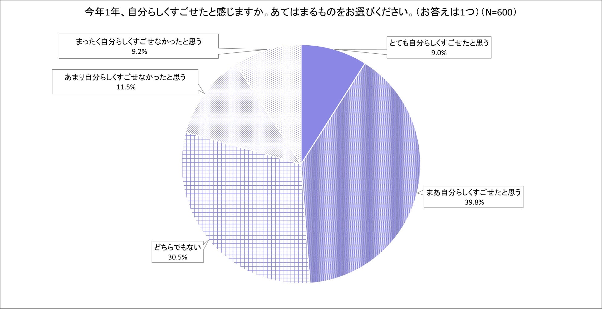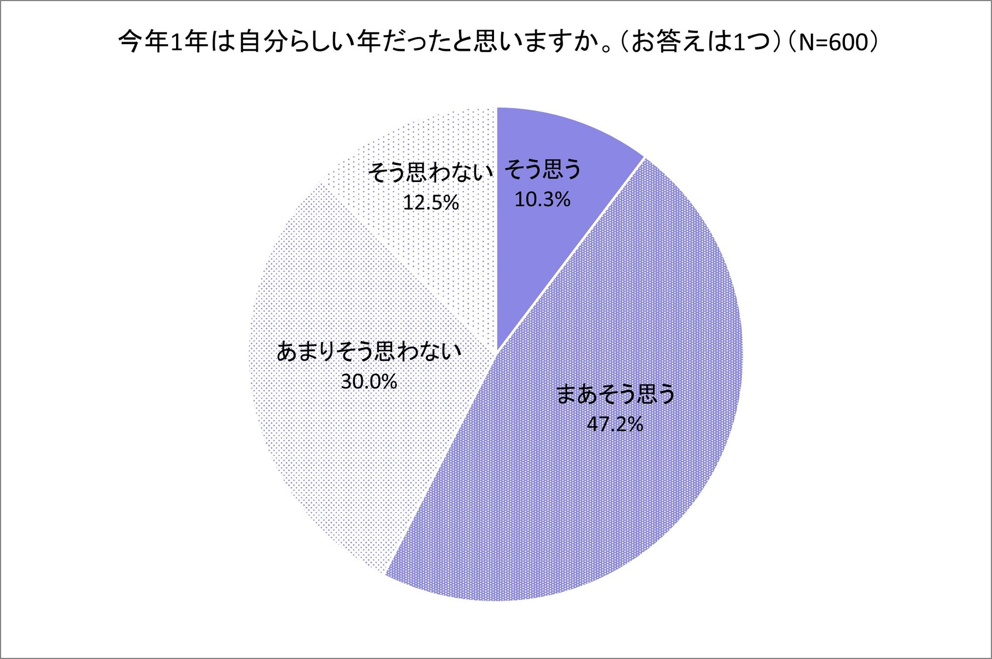 - このほか、Z世代をはじめとする若者の間で、自分のライフスタイルを重視するトレンドが広まりつつある中、約6割(57.5%)が今年は自分らしい年だったと答え、「無理をせず等身大でいられた(29.3%)」、「自分が納得できる選択ができた(20.9%)」、「仕事・プライベートともに充実できた(20.6%)」などの理由で約半数(48.8%)が自分らしく過ごせたと回答しており、自分らしさや自分の価値観を重視し、それを実現している人が多くいたことが推測できます。