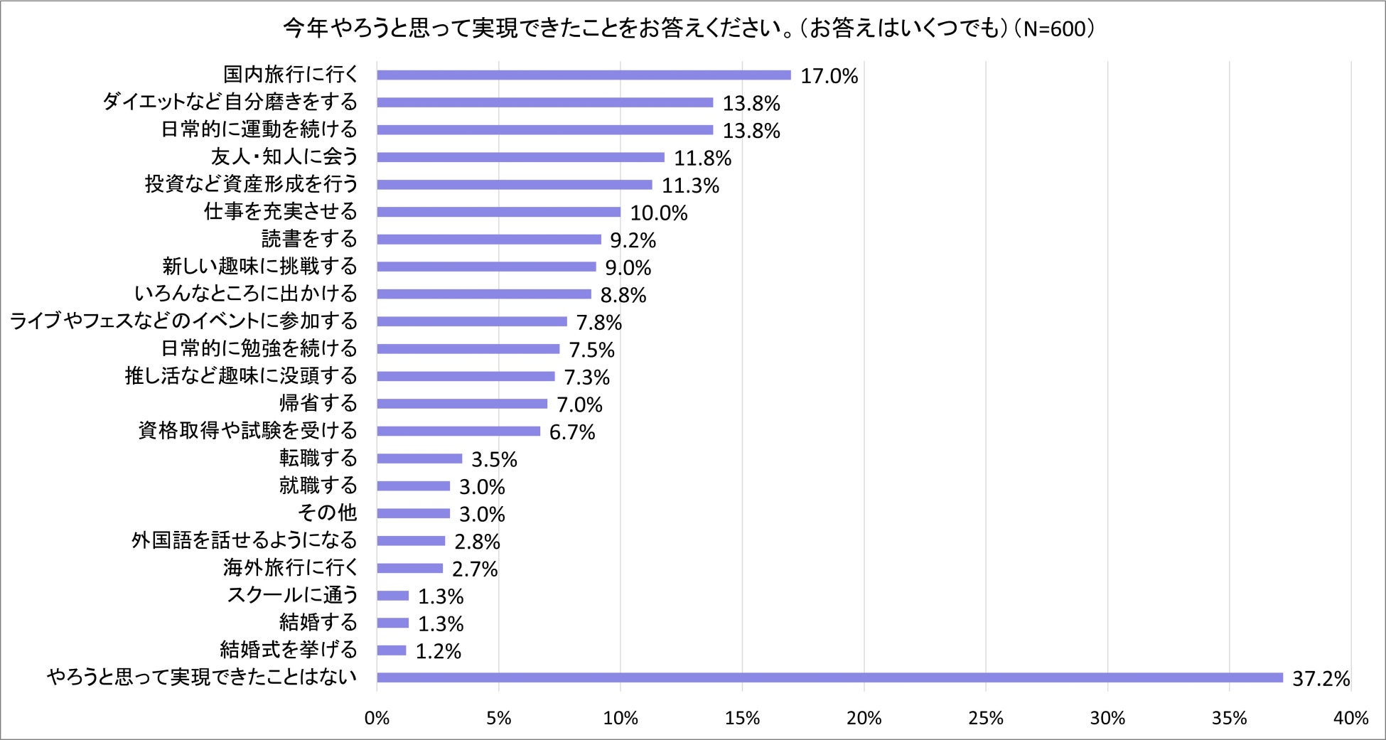 ● 半数以上(56.0%)が2021年と比較すると、今年の方が良い1年になったと感じ、6割以上(62.8%)が今年やろうと思ったことを実現できたと回答。その理由として、国内旅行(17.0%)、ダイエットなどの自分磨き(13.8%)、日常的な運動(13.8%)をしたとの声が多かった。具体的な回答では、「マンションを購入する」「家を建てる」といった人生の大きな買い物をした方や、「犬を飼う」「断捨離」など日々の暮らしをさらに充実させるもの、「フォトウェディング」といった記念に残るものなど、大小問わず、思い思いのやりたいことを叶えた人が多かった。また、最近注目されている「副業」や「資格取得」のようなキャリアにつながる目標を達成した人も多数。