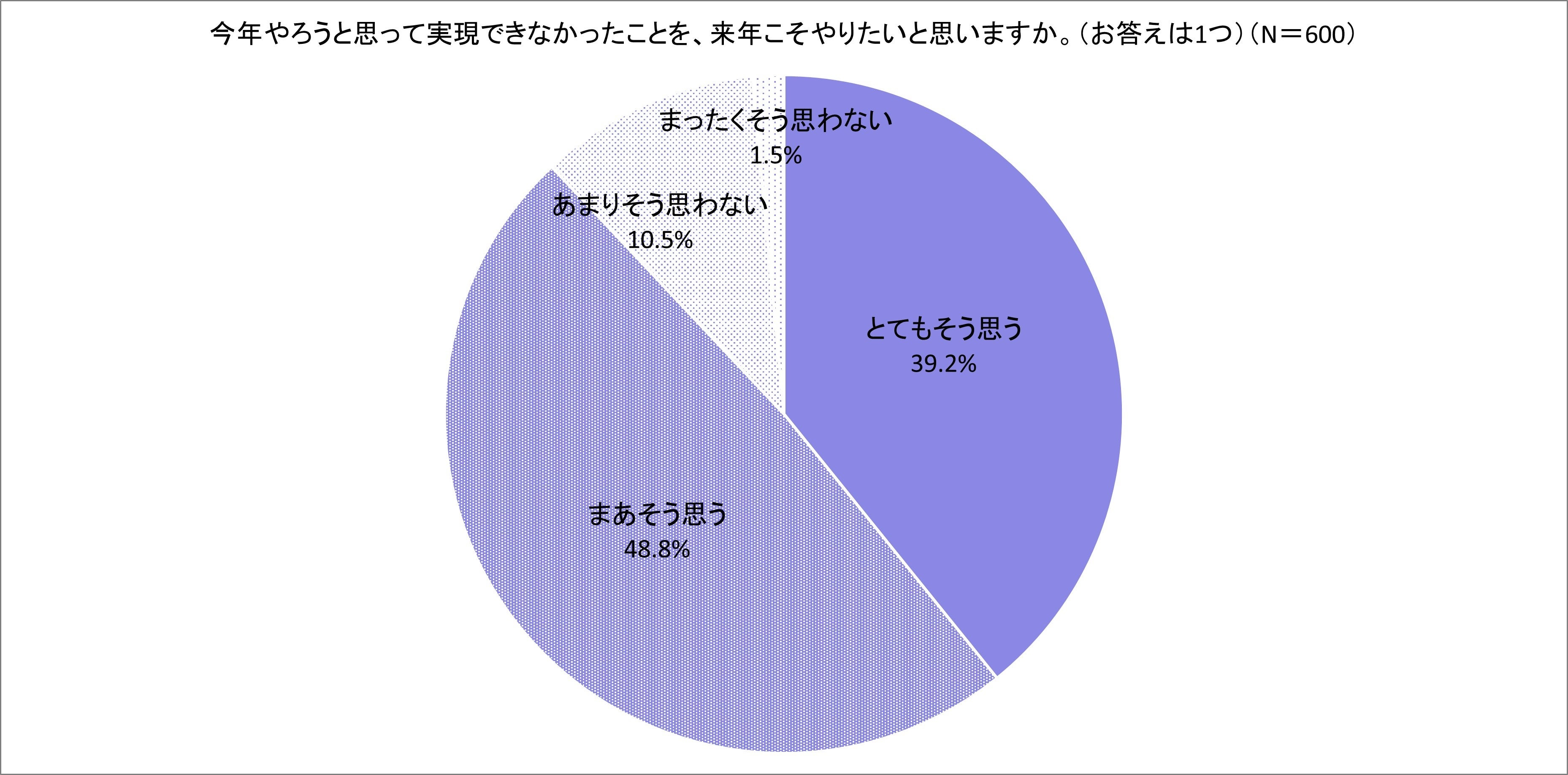● 約9割(88.0%)が今年実現できなかったことを来年は実施したい、5人に3人以上(64.3%)が新年の目標を立てたいと考え、来年に対する意欲が強く、より充実した1年を過ごしたいと考えている人が多いことがわかった。