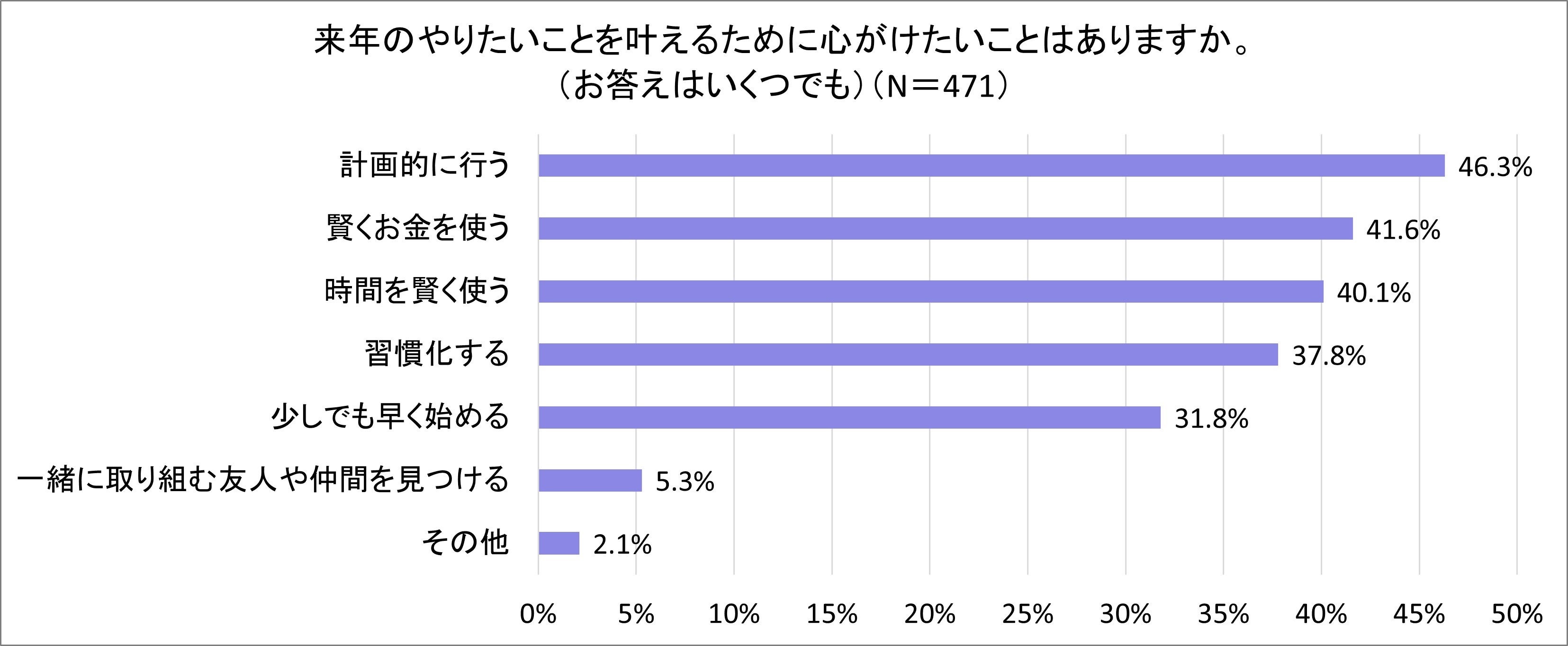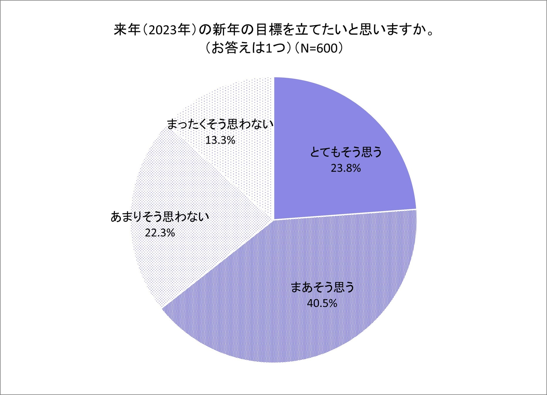 - 一方、2023年に対しても意欲的な人は多く、約9割が来年は今年よりも良い1年にしたい(88.4%)、今年実現できなかったことを来年は実施したい(88.0%)と回答しており、より良い1年にしたいという意気込みがデータからも伝わってきます。また、約8割(78.5%)が来年やりたいことがあり、それを叶えるために心がけたいこととして、少しでも早く始めると答えた人は約3割となり、フライングしてでもやりたいことに挑戦しようと考える人が一定数いることが判明しました。また、5人に3人以上(64.3%)が新年の目標を立てたいと考えていることが分かりました。