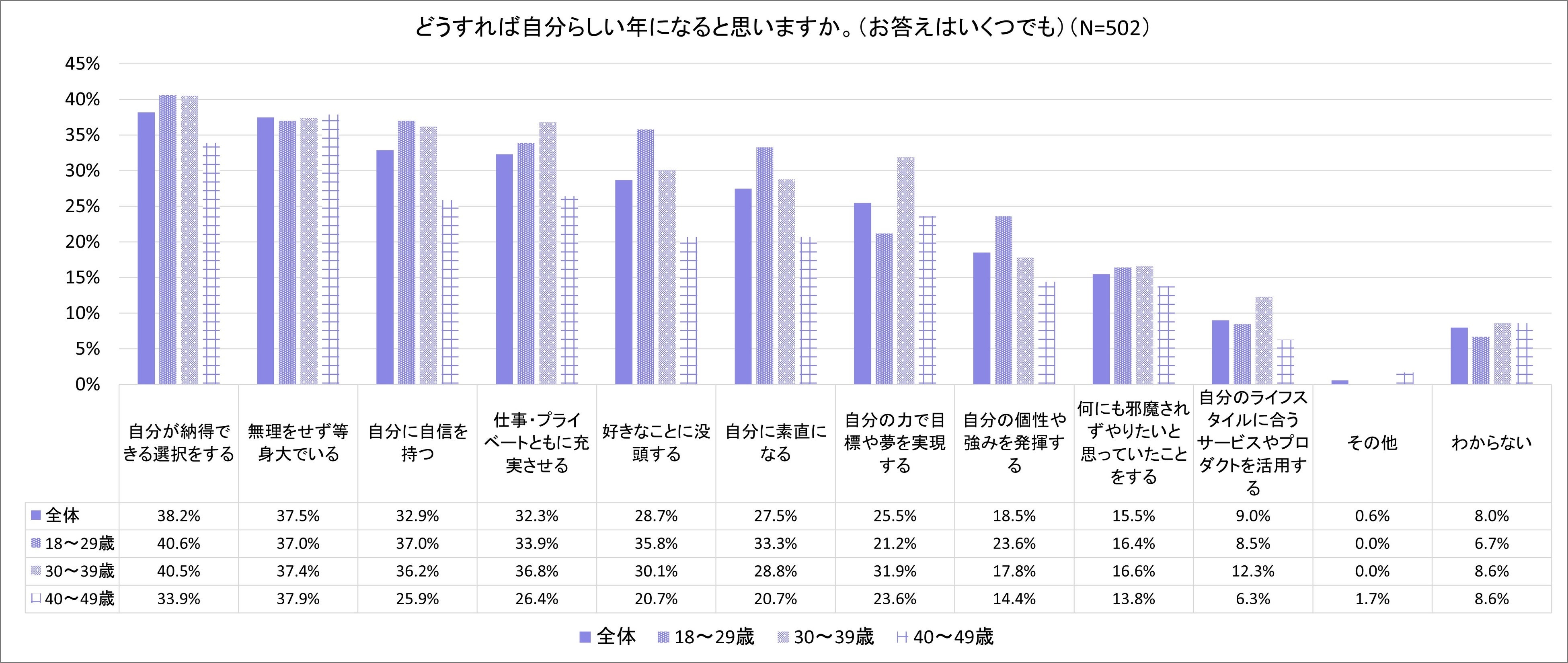 ● 8割以上(83.7%)が自分らしい1年を過ごしたいと考えており、自分らしさの紐解きとしては、自分が納得できる選択をする(38.2%)、無理をせず等身大でいる(37.5%)、自分に自信を持つ(32.9%)ことが多い結果となった。また、18~29歳の若い世代では、仕事・プライベートともに充実させる(33.9%)、自分に素直になる(33.3%)こととの声も多く上がった。なかには、自分のライフスタイルに合うサービスやプロダクトを活用する(9.0%)との声も一定数上がり、商品選択時にも自分らしさを大切にしていることが推測できる。