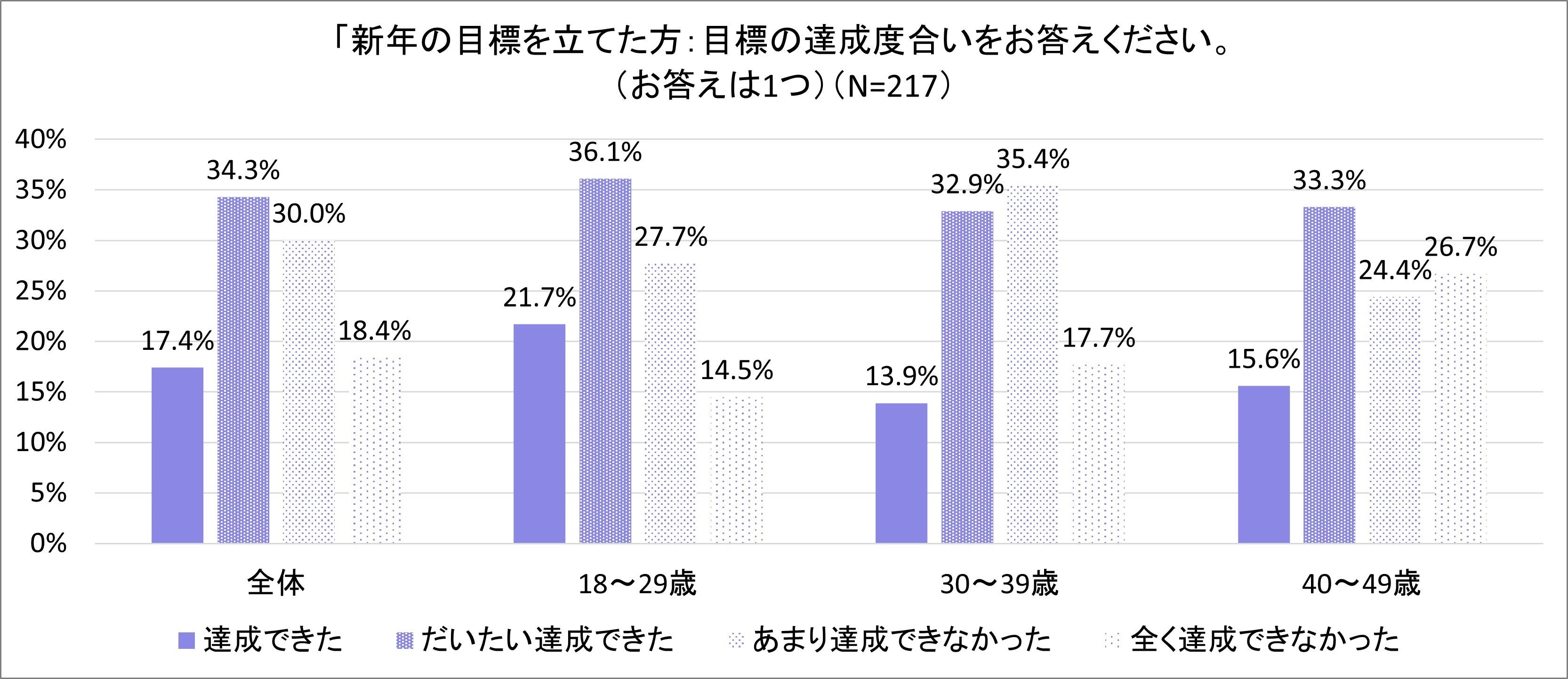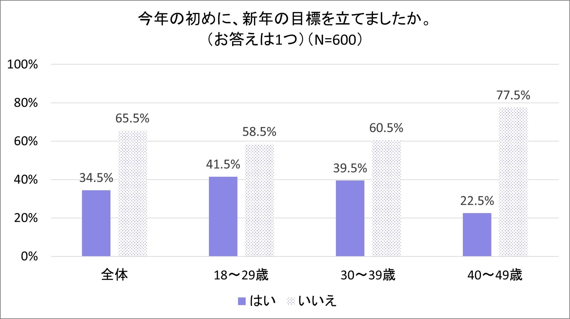 - 今年の初めに目標を立てた人は3割以上(34.5%)。特に20代と30代は意欲的で、その割合が高く、それぞれ約4割となりました(20代:41.5%、30代:39.5%)。また、その目標を達成できた人は約半数(51.7%)で、特に20代の達成率が高く、約6割(57.8%)となり、より若い世代が自分の目標に向けて積極的に取り組んだことがわかります。