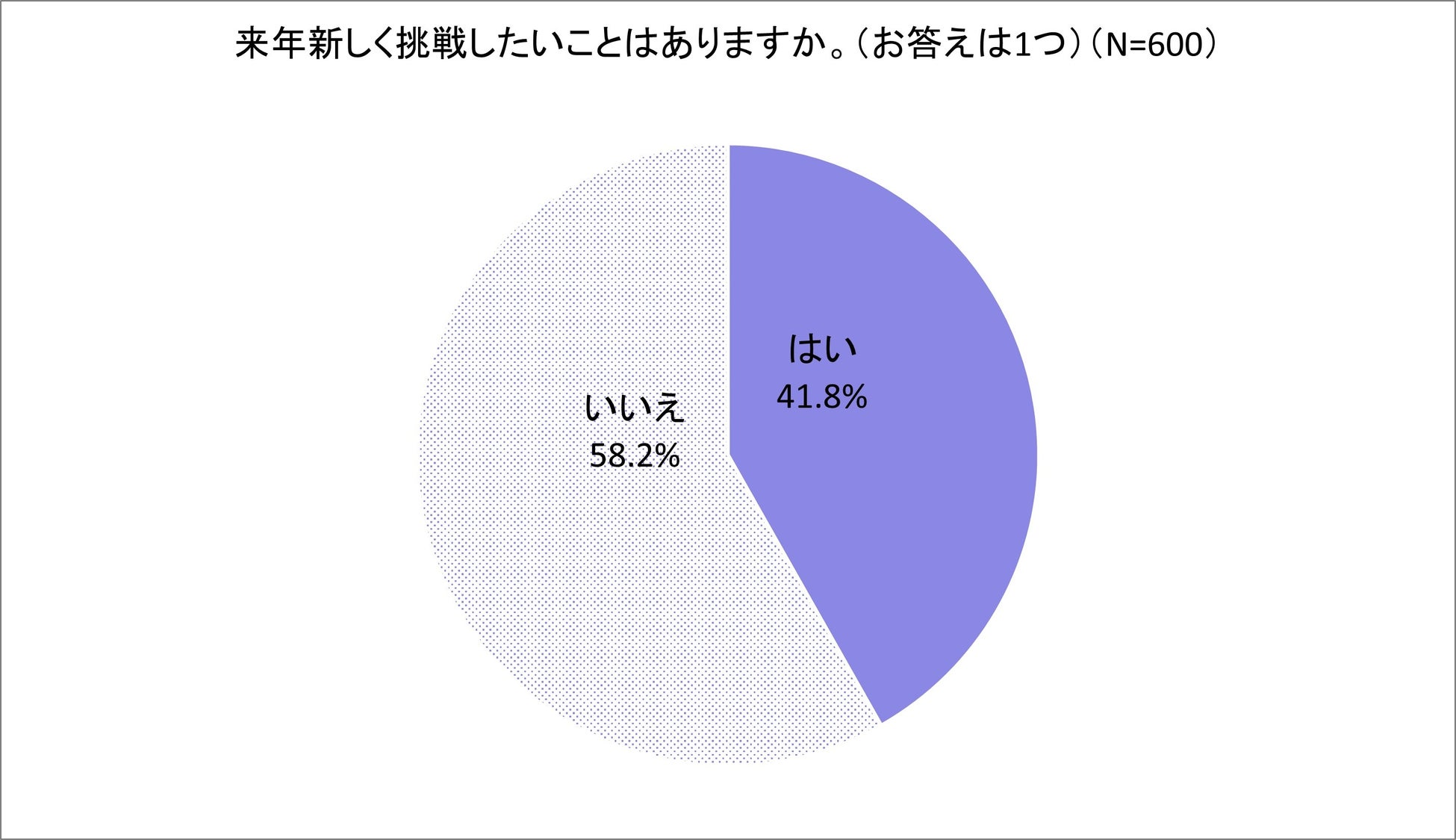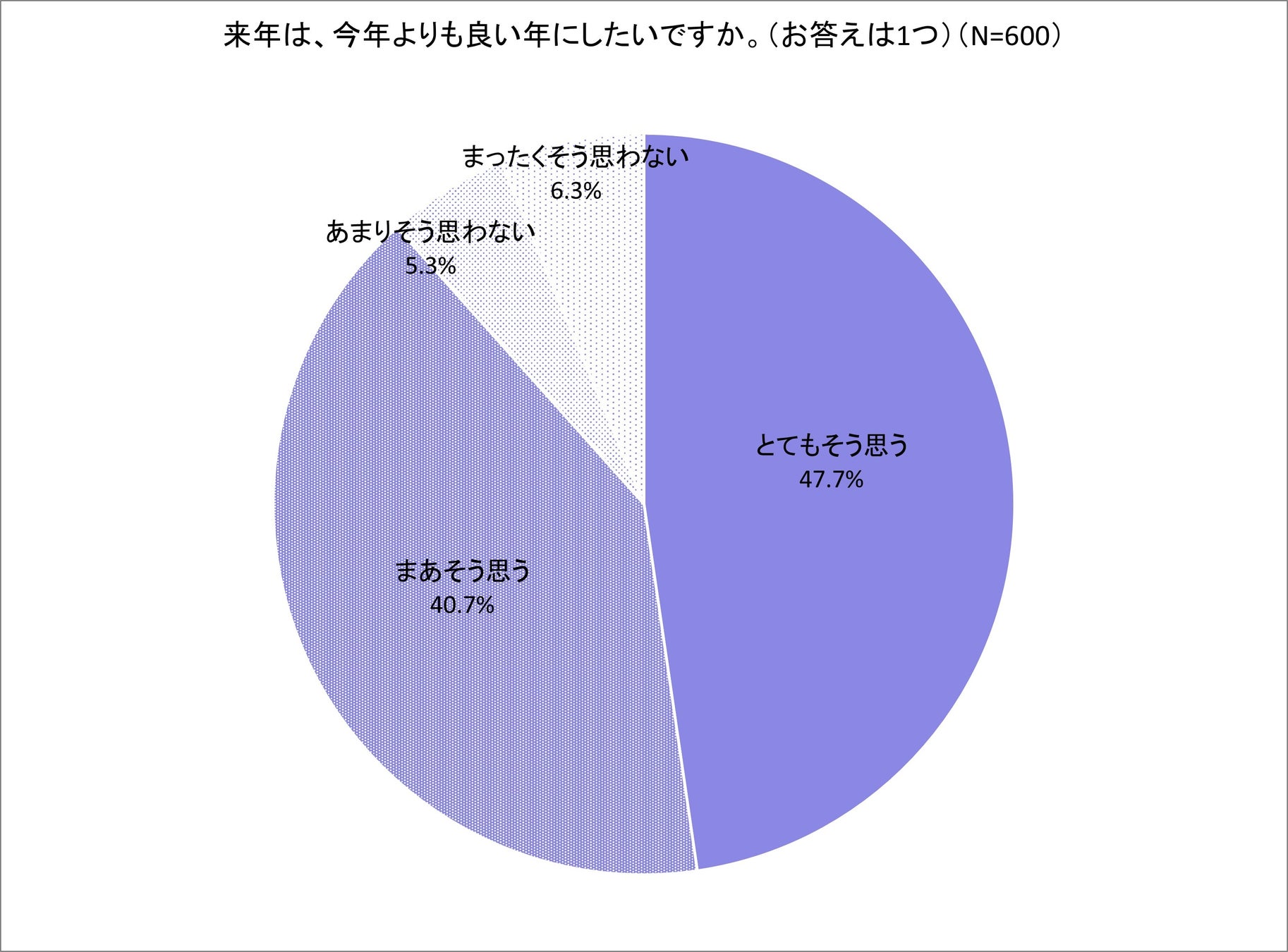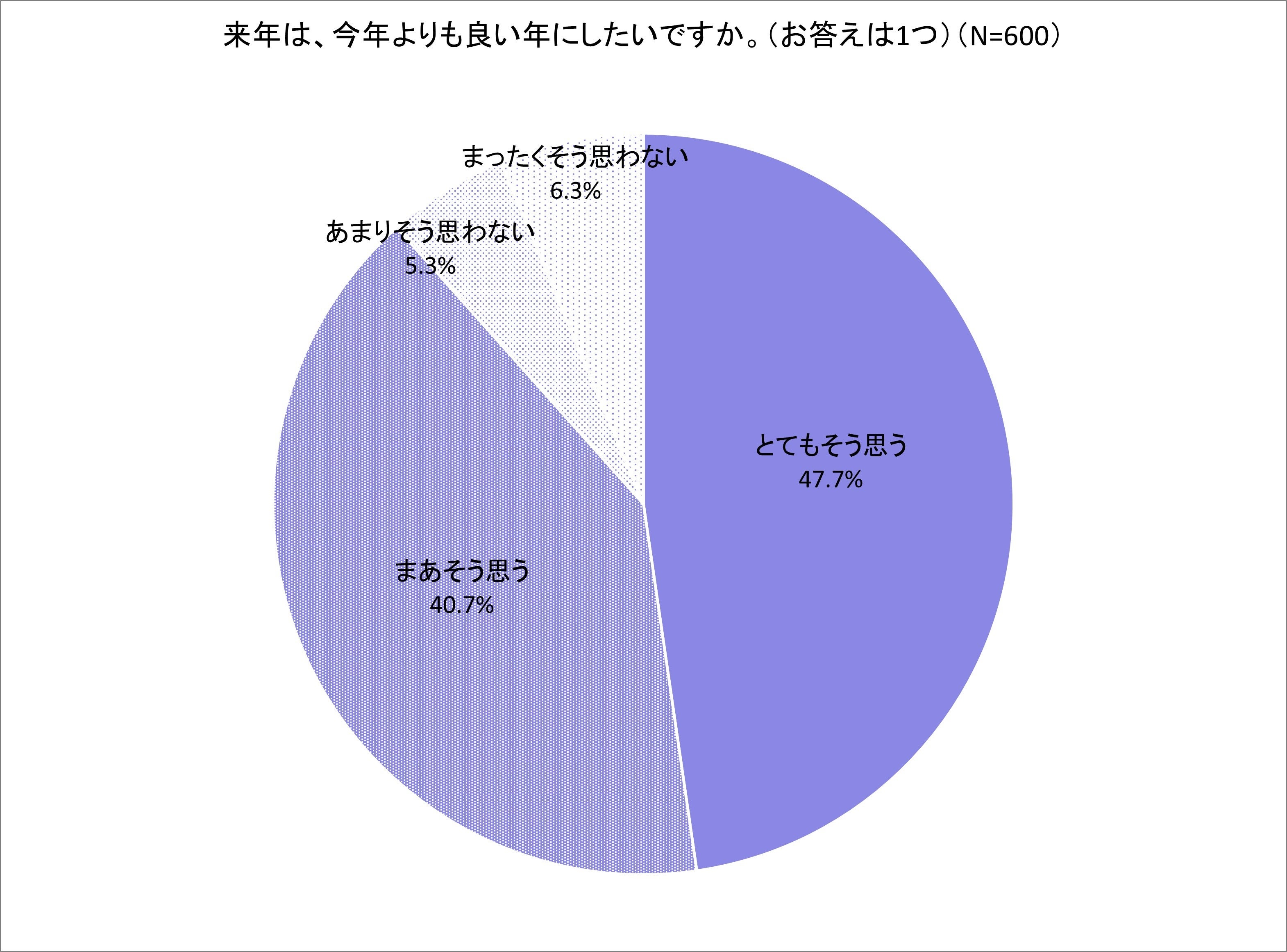 ● 自分磨きや資格取得、新たな趣味など、5人に2人以上(41.8%)が来年新しく挑戦したいことがあり、約9割(88.4%)が来年は今年よりも良い1年にしたいと回答し、大多数が来年に対してポジティブに考え、充実した年にしたいと期待している。