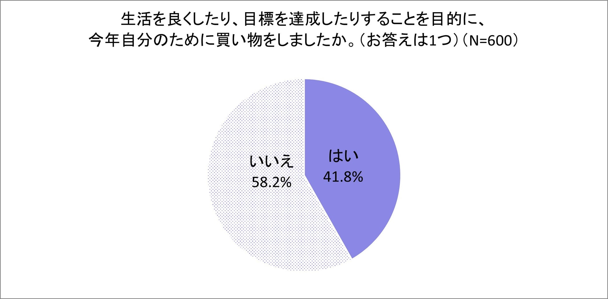- また、4割以上(41.8%)が生活を良くしたり、目標の達成を目的に、自分のために買い物をしたと答え、買い物を通して自身の生活を楽しく豊かにしている様子が伺えます。具体的には、日々の生活の質を向上させたり、自分に自信をつけるアイテムを購入した人が多く、「冷凍弁当を買って、栄養のバランスも良く、時短できた」「ガスコンロを買い替えて、自炊が楽しくなった」「モテるために、春と秋に着れる服を買った」などが挙がりました。さらには、「サボテンや野菜の苗を買って農業に挑戦し、農家の大変さを経験できた」など、新しい挑戦に積極的に取り組んだ人もいました。