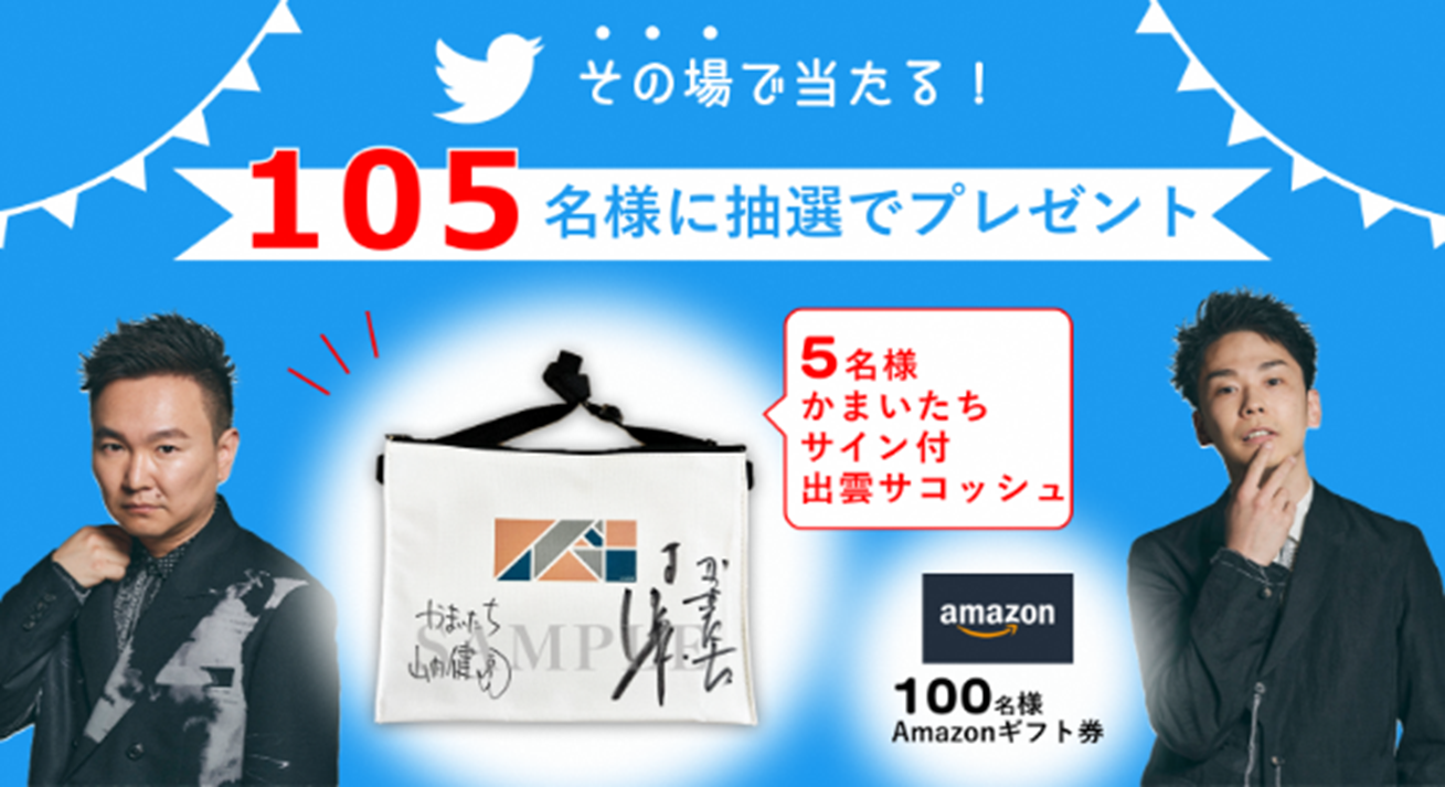 ①フォロー&リツイート ②#かまいたちと出雲大社巡り をつけて投稿していただいた方に「5名様にかまいたちのサイン付き出雲サコッシュ」「100名様にAmazonギフト券100円分」がその場で抽選で当たるキャンペーン。