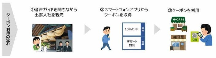 本商品を購入したユーザーは、音声ガイドアプリ内で、出雲市内の土産品店や道の駅、宿泊施設など30店舗(今後も随時増えていく予定)で20回利用できるデジタルクーポンを取得することが可能です。デジタルクーポンを利用する際には音声ガイドアプリで店舗に設置されたQRコードを読み込むことで利用可能です。