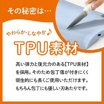 ドブレは弾力性のあるTPUという素材を採用しているので、キズが入りにくく、衛生的に使うことのできるまな板です。