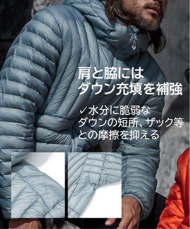 肩と脇下には保温性と耐久性アップ。水分に脆弱なダウンの短所を補い、ザック等との摩擦を抑えます。