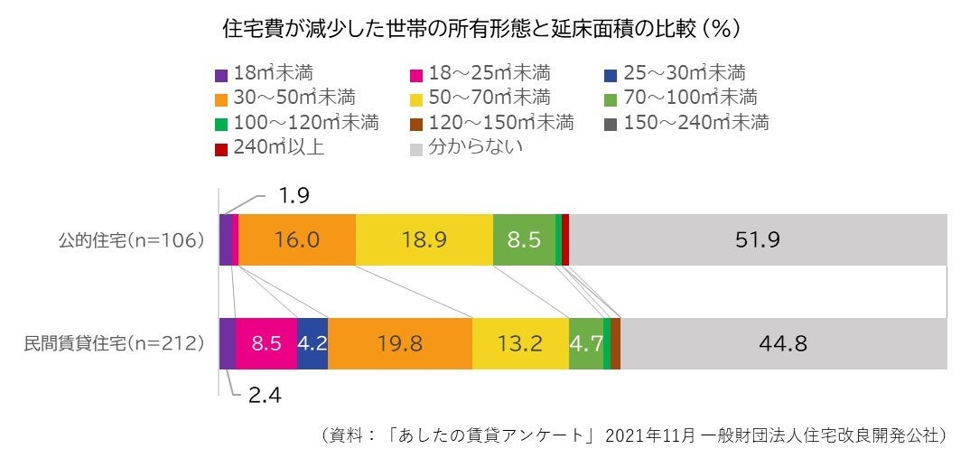 住居費が減少した世帯を公的住宅・民間賃貸住宅別、延床面積別でみると、公的住宅では30㎡未満の住戸が少なく、2.8%となっている。加えて、50㎡未満の住戸は公的住宅で18.8%、民間賃貸住宅で34.9%となっています。つまり、公的住宅で入居が少ない部分を民間賃貸住宅でカバーしているような結果が現れています。