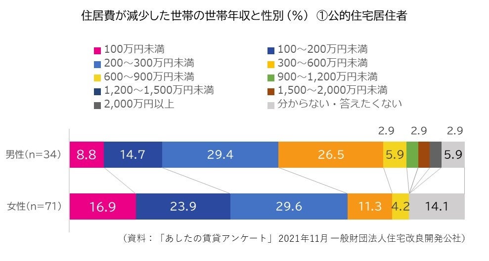 住居費が減少した世帯を公的住宅・民間賃貸住宅別、性別でみると、公的住宅居住では、世帯年収が300万円未満世帯の割合が男性は52.9%、女性70.4%と17.5ポイントも女性の割合が高くなっています。民間賃貸居住でも同様に、300万円未満世帯の割合が男性は32.7% 女性50.5%と17.8ポイントも女性のポイントが高くなっています。平成30年住宅・土地統計調査によると、日本の住宅で居住されている住宅ストックのうち、公的住宅は約5%しかないため、住居費が減少するような経済的事情等での住み替えについては、民間賃貸住宅が支えている状況といえます。