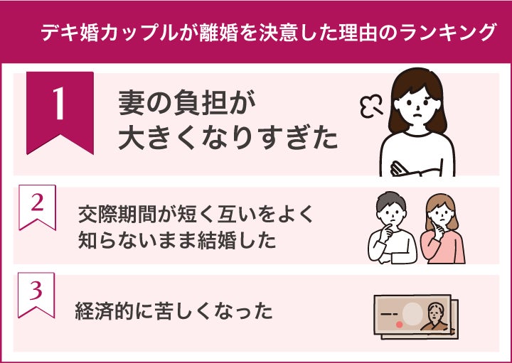 デキ婚カップルが離婚を決意した理由で1番多いのが「女性の負担が大きくなりすぎた」です。