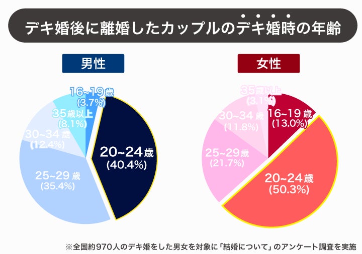 後述するように、デキ婚者の7割は20代で結婚していますが、そのうち離婚している人は20代前半で結婚している傾向がわかります。