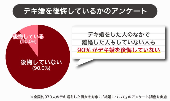 デキ婚を後悔しているかどうかを聞いたアンケートでは、970人中875人が「後悔していない」と回答しています。