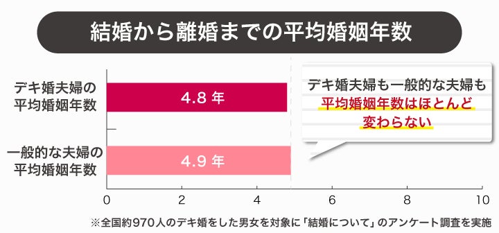 また、デキ婚して離婚した夫婦に絞って同じ質問をしても、平均して4.8年という結果です。