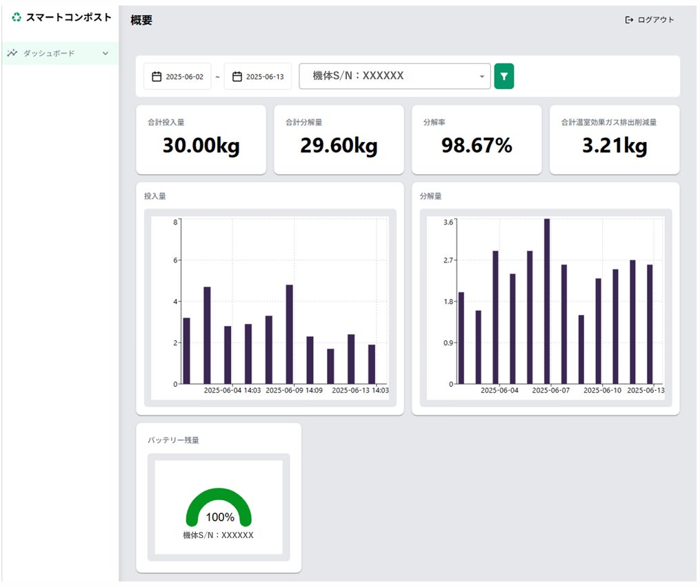 ・運用状況の見える化:投入量や分解率、温室効果ガス削減量をクラウドで確認でき、環境施策の成果を具体的に把握可能