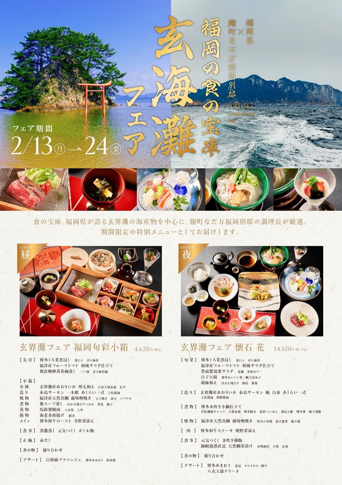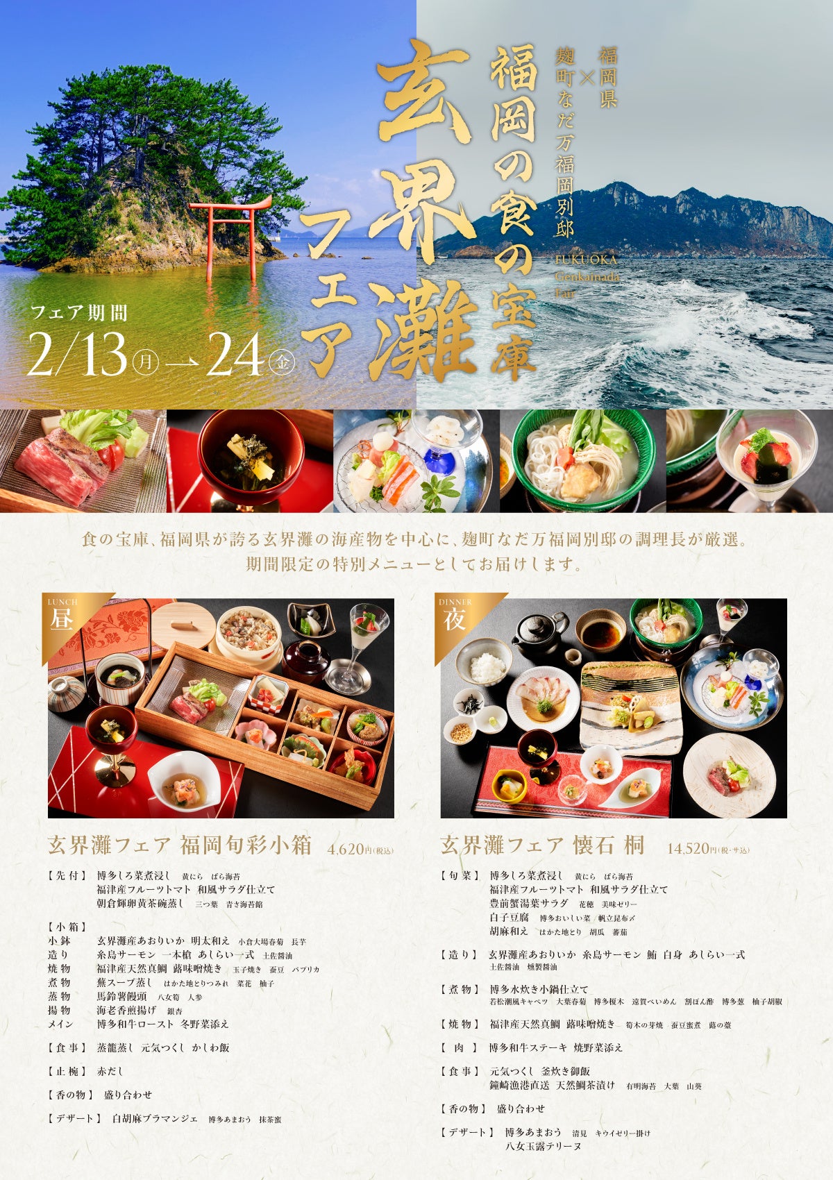 福岡県では、『福岡の食の宝庫 玄界灘フェア』と題して、福岡県アンテナレストラン「麹町なだ万 福岡別邸」(東京・半蔵門)にて、玄界灘の豊かな陸の恵みを味わえる特別メニューの提供を行います(2023年2月13日(月)~24日(金)まで・日祝除く)。