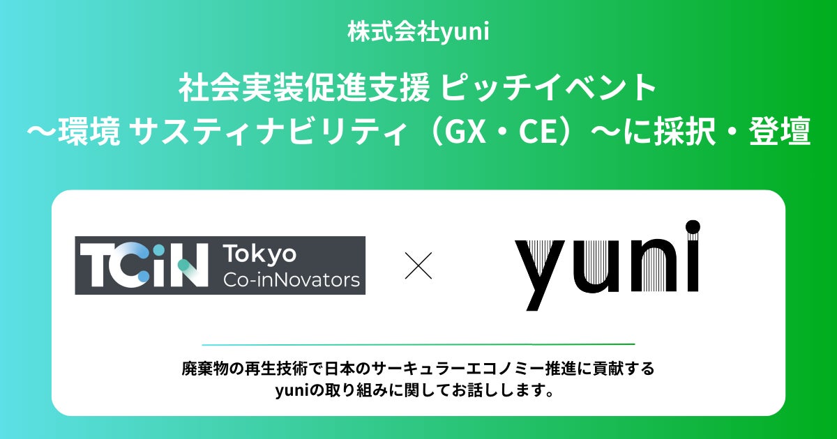 廃棄物を資源に変える技術開発と再生素材化事業を展開する株式会社yuni(本社:東京都渋谷区、代表取締役CEO:内橋堅志)は、東京都が主催する社会課題解決型スタートアップ支援事業「社会実装促進(マッチング)支援_環境サステナビリティ・GX」第1期に採択されたことをお知らせします。
